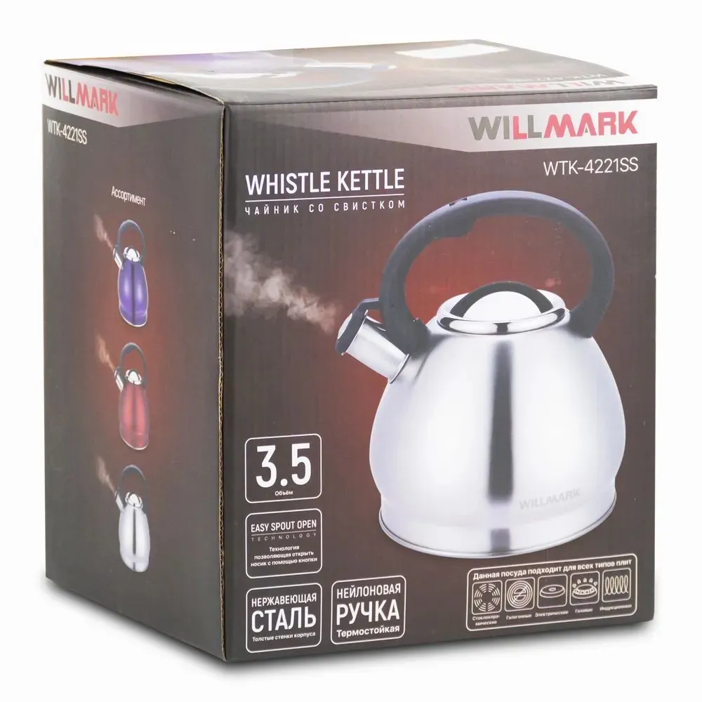 Чайник WILLMARK WTK-4221SS (3,5л, со свистком, с крышкой, нейлоновая ручка, техн. Easy spout open)