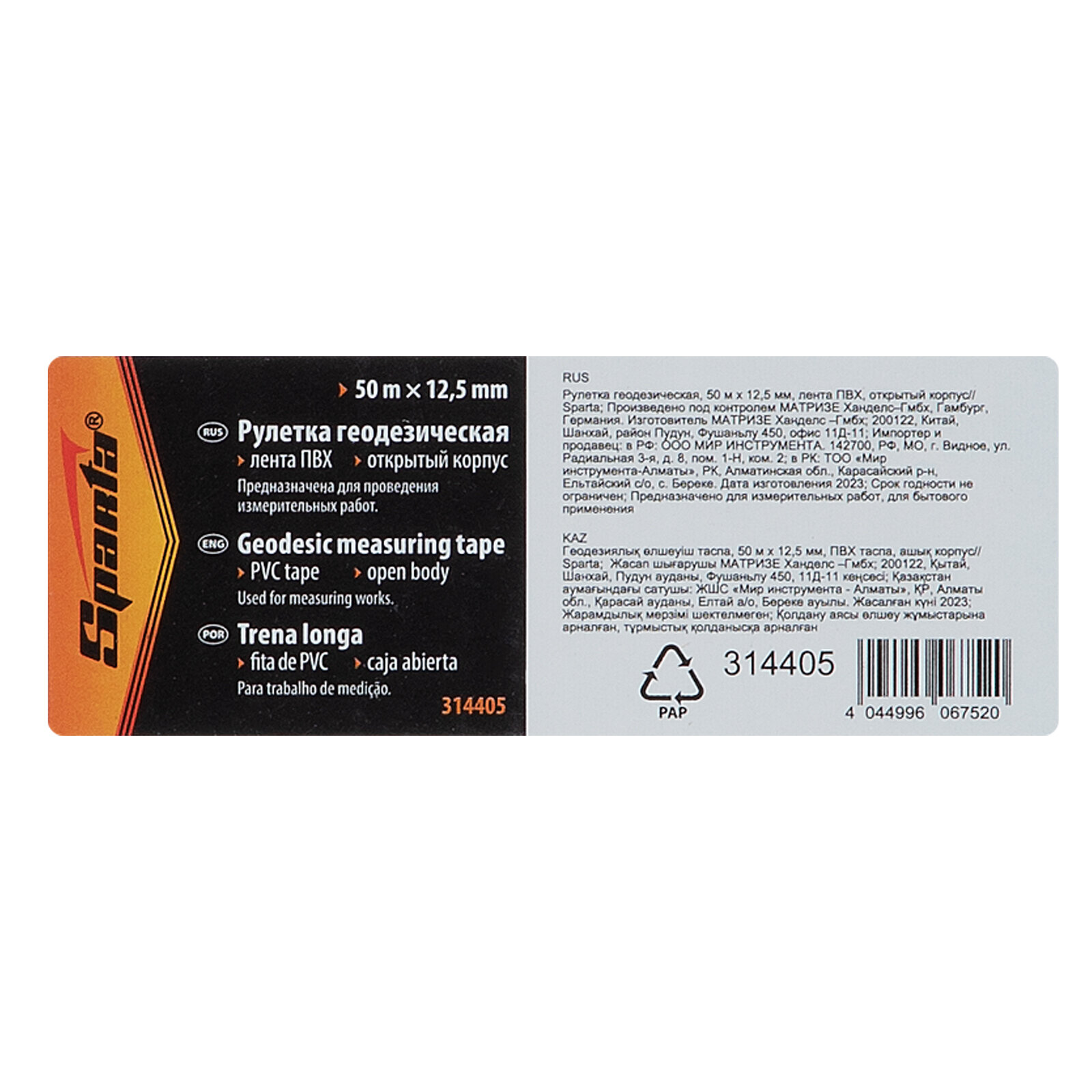 Рулетка геодезическая, 50 м х 12,5 мм, лента ПВХ, открытый корпус// Sparta 314405 .