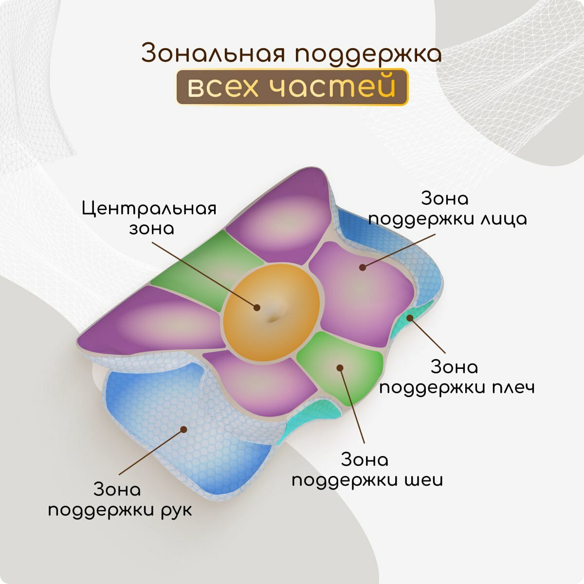 | Особенности | валики разной высоты / гипоаллергенная / охлаждающий эффект / против морщин / съемный чехол / эффект памяти |