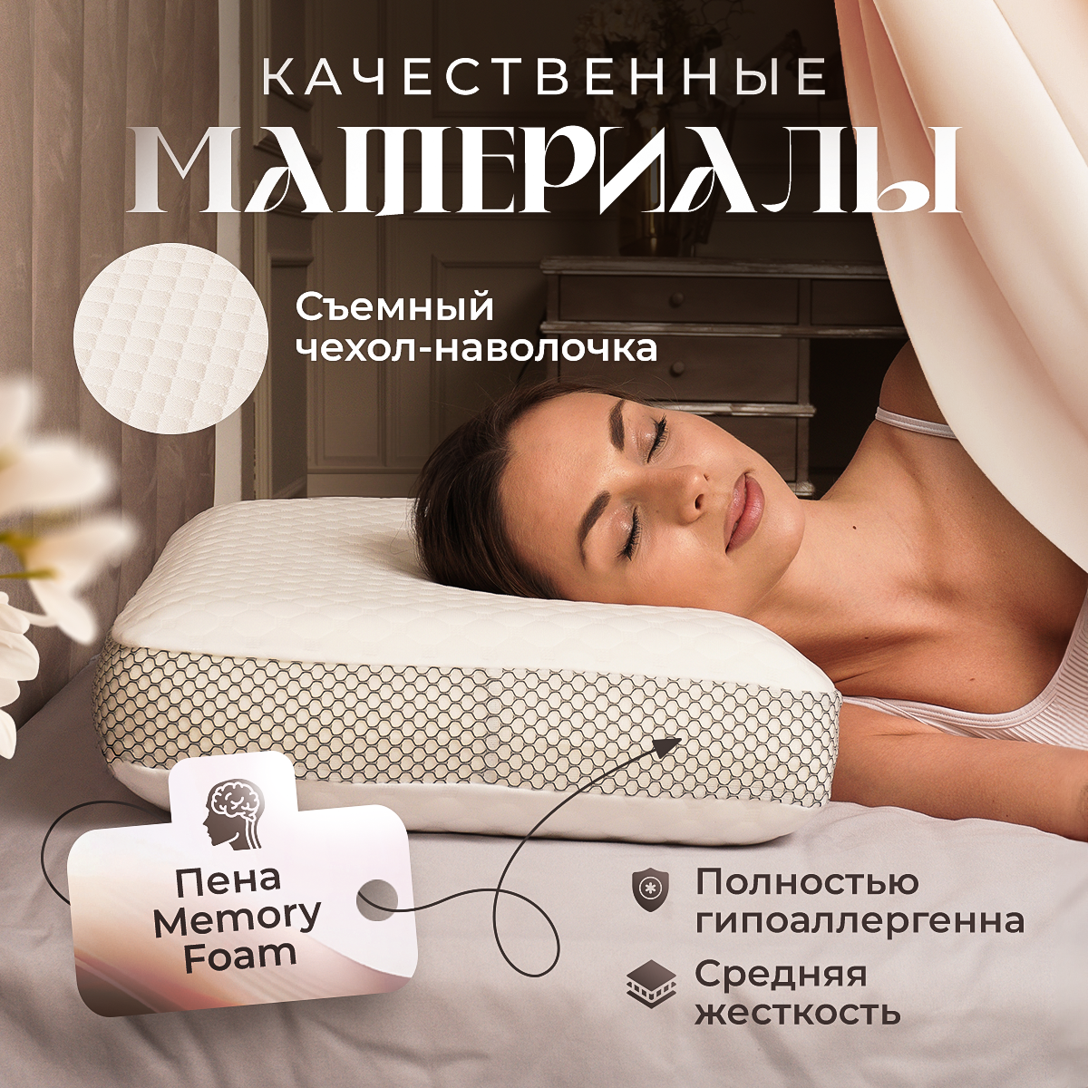 | Особенности | гипоаллергенная / охлаждающий эффект / против морщин / съемный чехол / эффект памяти |