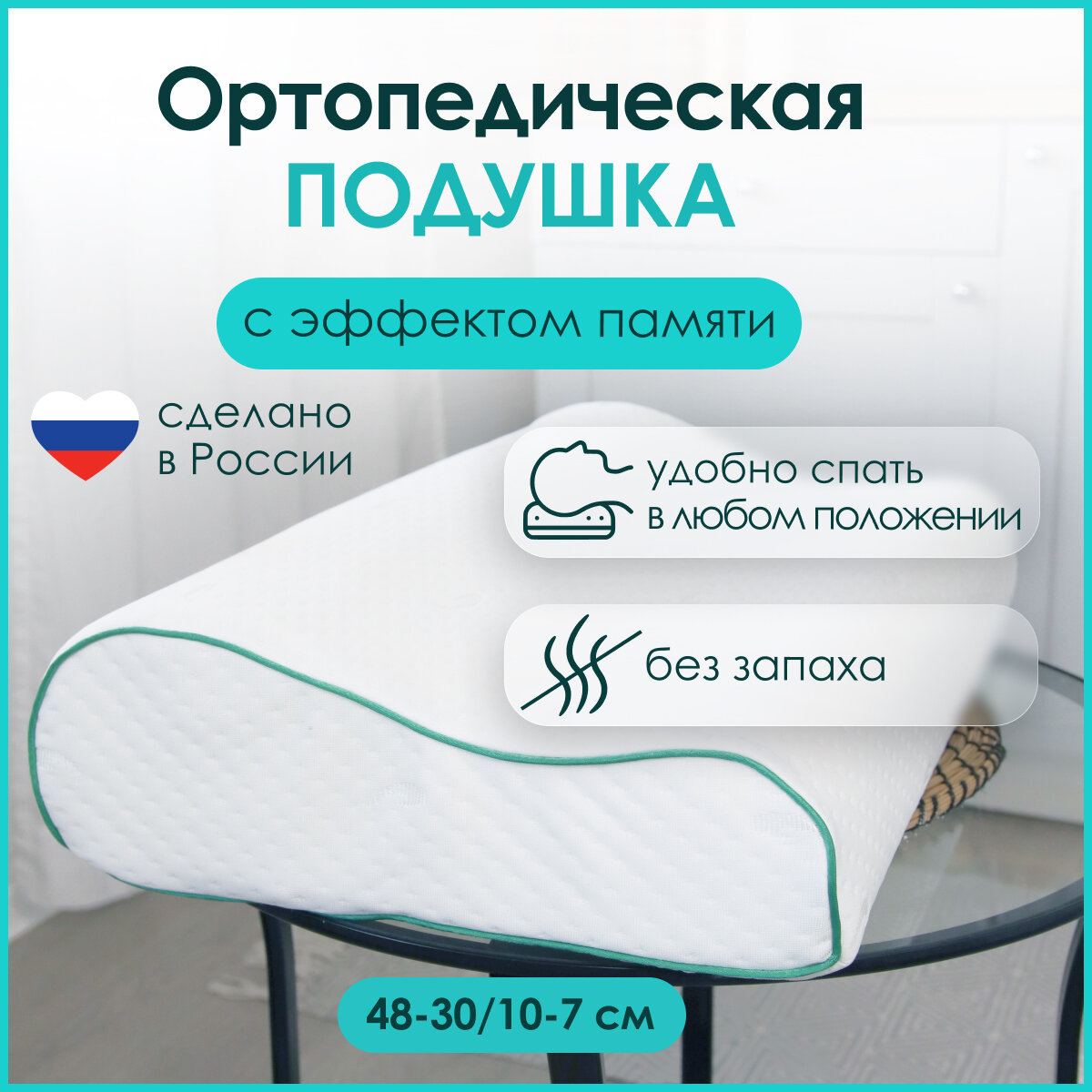 Ортопедическая подушка, Memory Foam, с эффектом памяти, средней жесткости, маленький размер, 48х30, валики 10 и 7 см