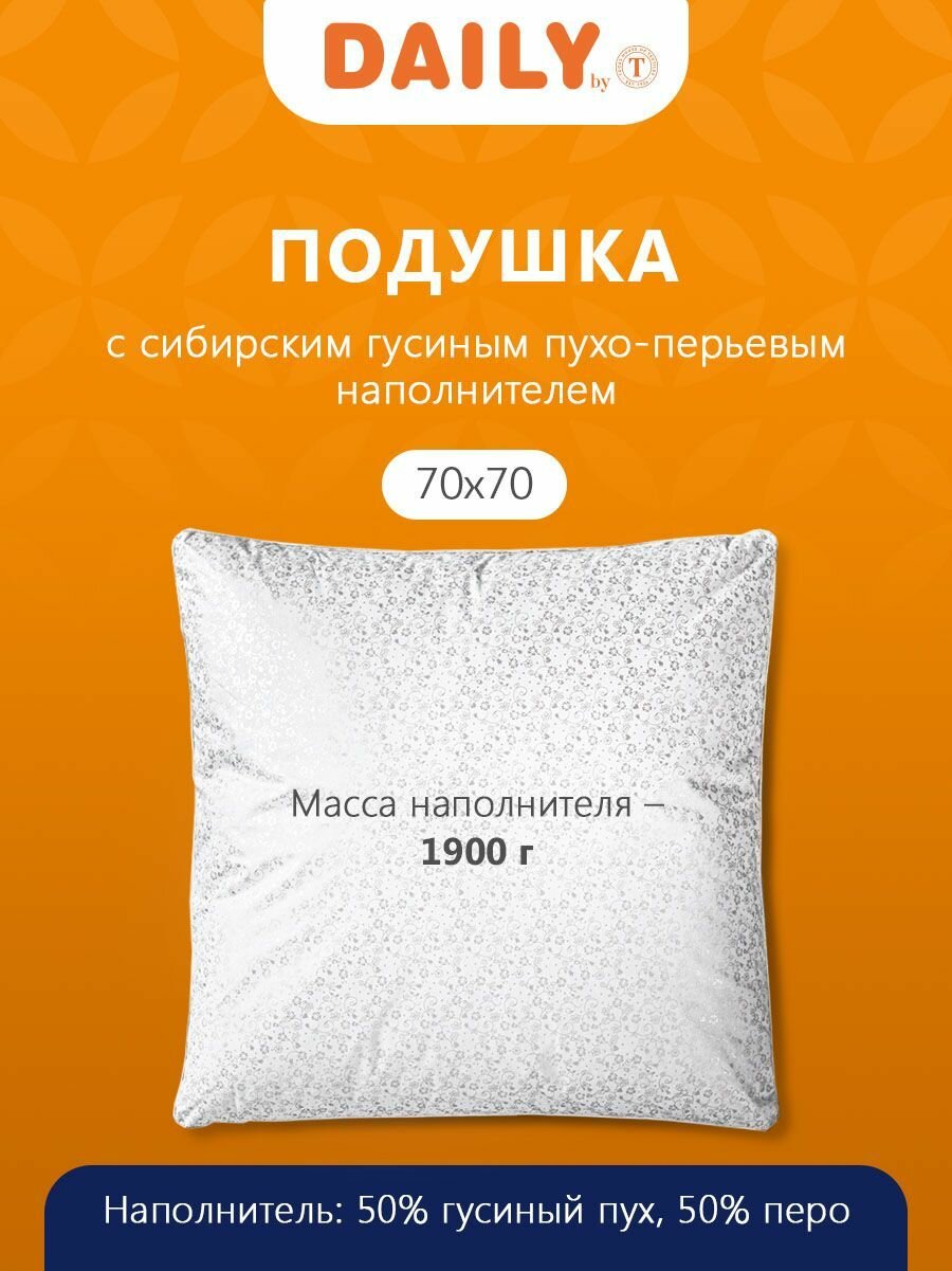 Купить Daily by T Подушка "Пух-перо в тике" хлопок, пух Уральского гуся, Средняя жесткость, 70x70 1-пр.