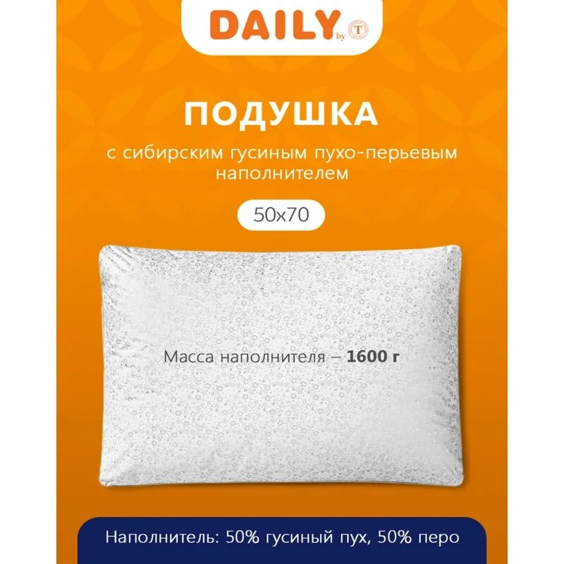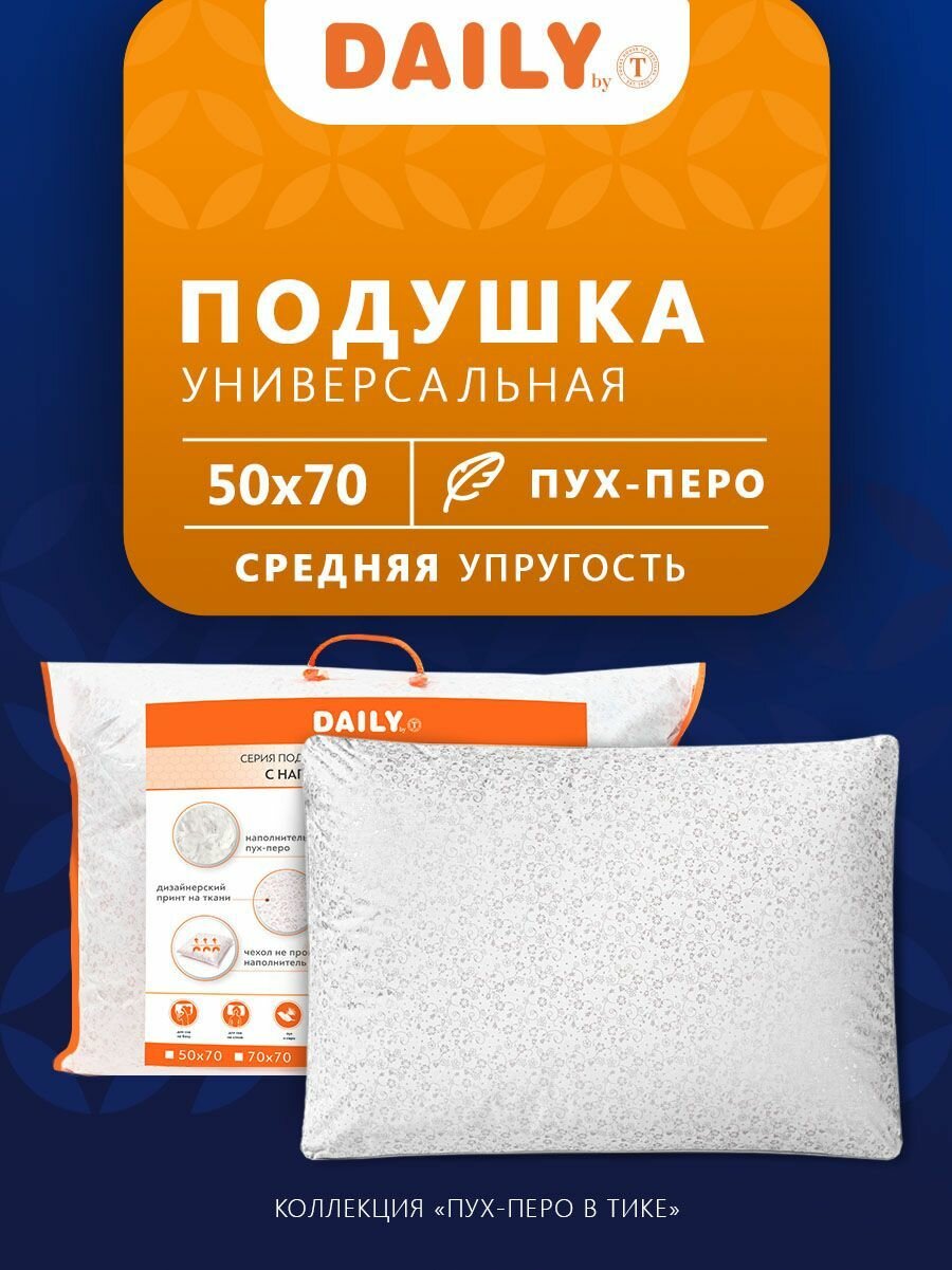 Купить Daily by T Подушка "Пух-перо в тике" хлопок, пух Уральского гуся, Средняя жесткость, 50x70 1-пр.