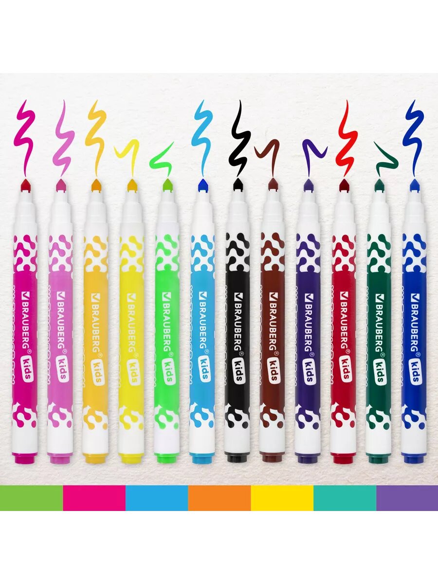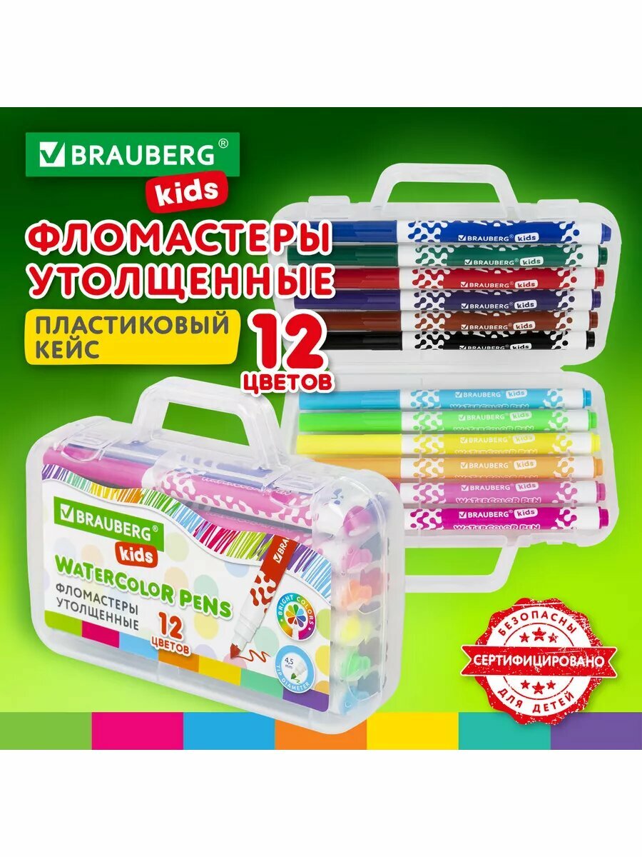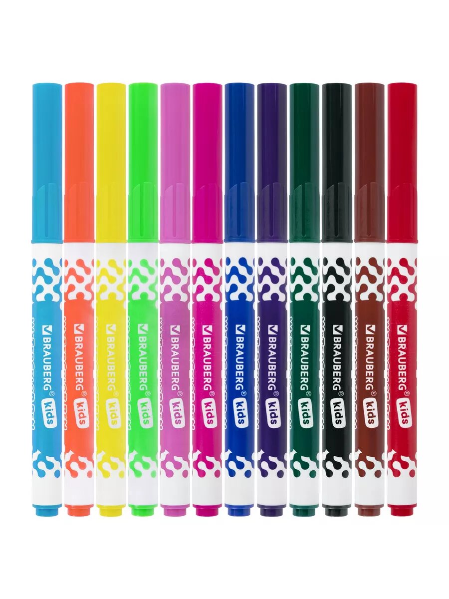 Фломастеры для рисования для детей набор Brauberg Premium, 12 цветов, Корпус С Печатью, вентилируемый колпачок, 151942
