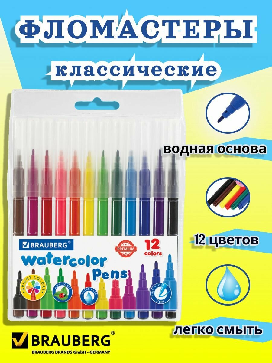Фломастеры Brauberg "PREMIUM", классические, водная основа, толщина линии 2 мм, 12 цветов