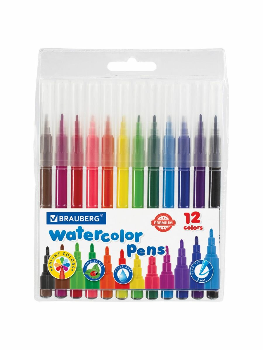 Фломастеры Brauberg "PREMIUM", 12 цветов, корпус С печатью, вентилируемый колпачок, ПВХ-упаковка с европодвесом