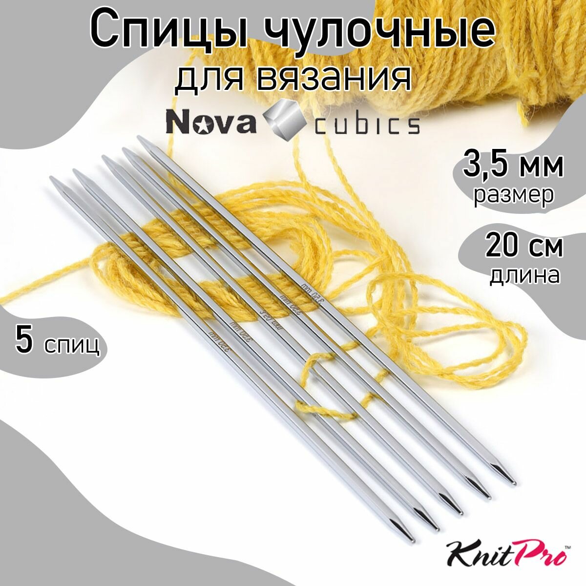 12127 Knit Pro Спицы чулочные для вязания Nova cubics 3,5мм/20см, никелированная латунь, серебристый, 5шт