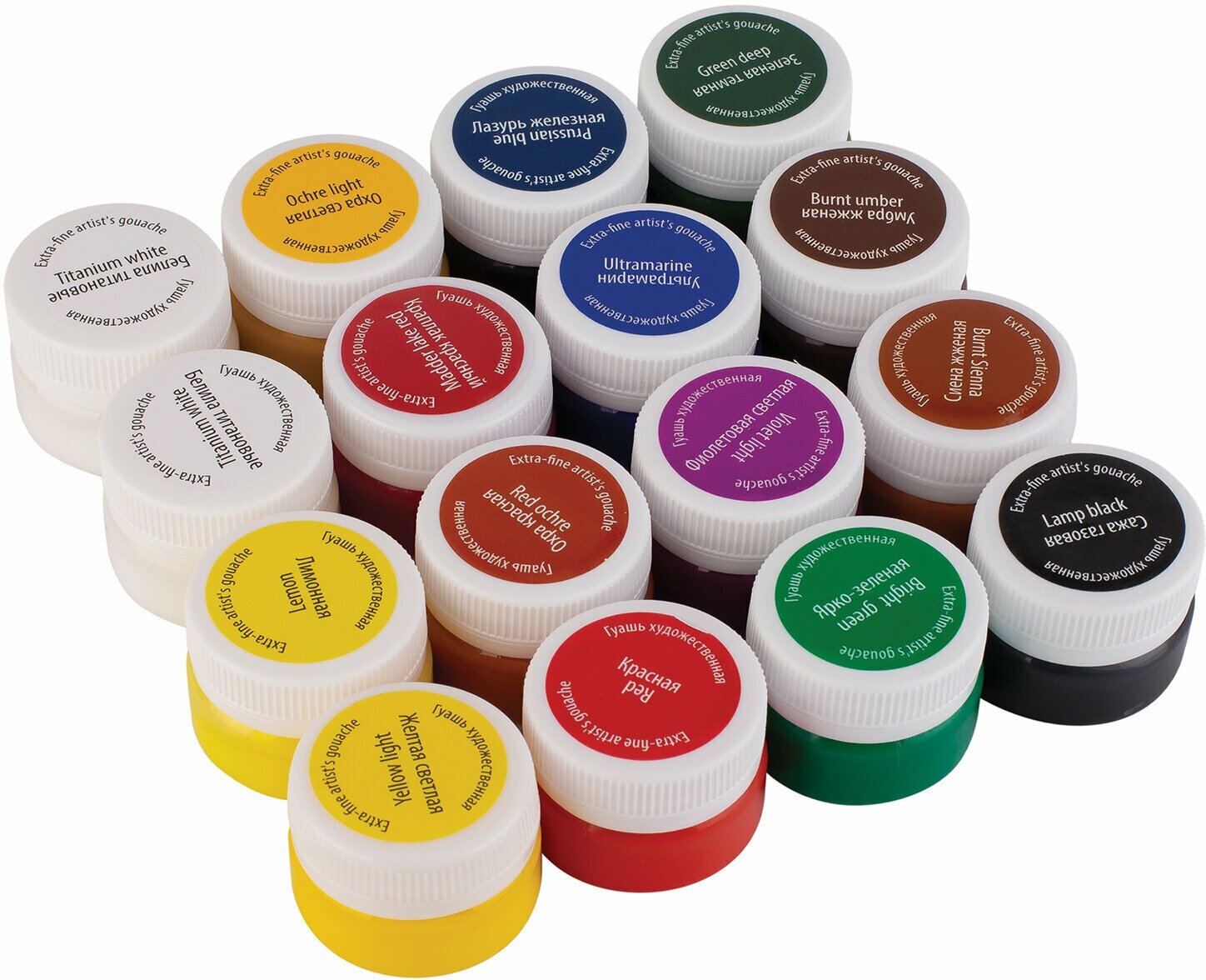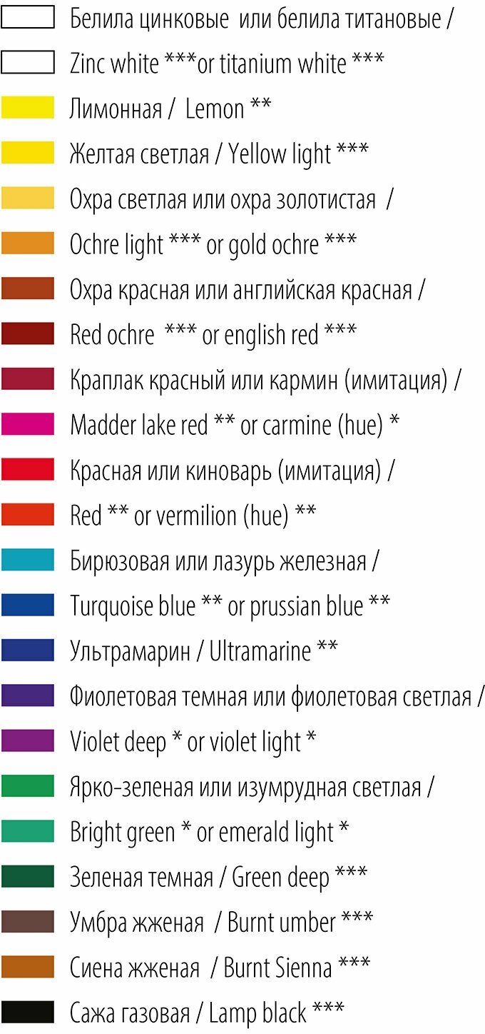 | Комплектация | цвета: белила цинковые или белила титановые (2 баночки), лимонная, желтая светлая, охра светлая или охра золотистая, охра красная или английская красная, краплак красный или кармин, красная или киноварь, бирюзовая или лазурь железная, ультрамарин, фиолетовая светлая или фиолетовая темная, ярко-зеленая или изумрудная светлая, зеленая темная, сиена жженая, умбра жженая, сажа газовая |