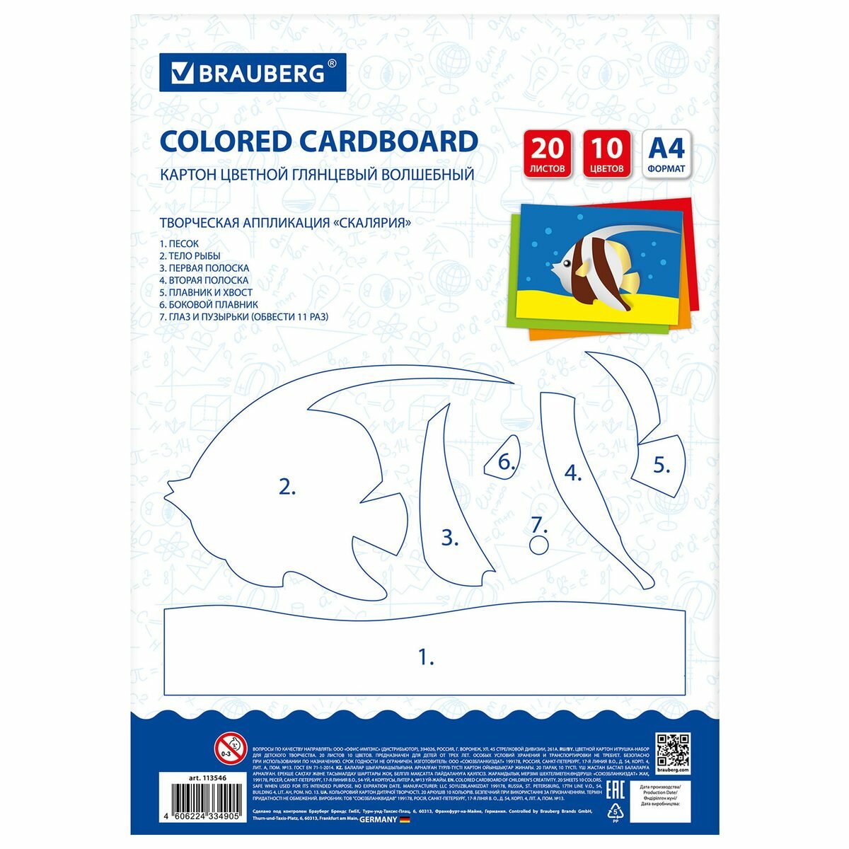 Купить Картон цветной мелованный Brauberg "Волшебный" (20 листов, 10 цветов, А4, 200х290мм, в папке) (113546), 4 уп.