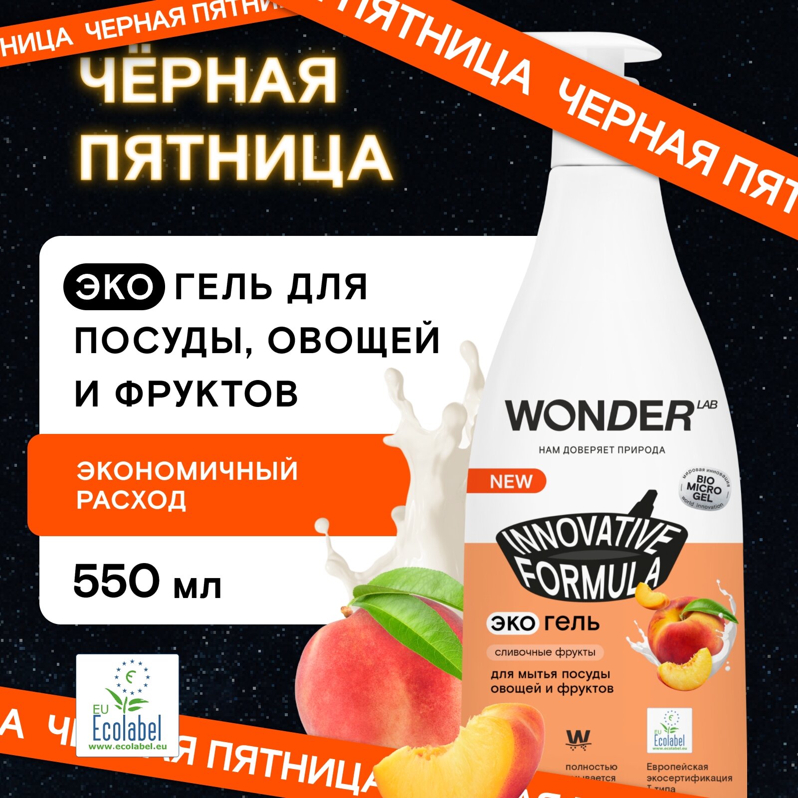 Эко гель для мытья посуды овощей и фруктов с нежным ароматом сливочных фруктов WONDER LAB, 550 мл