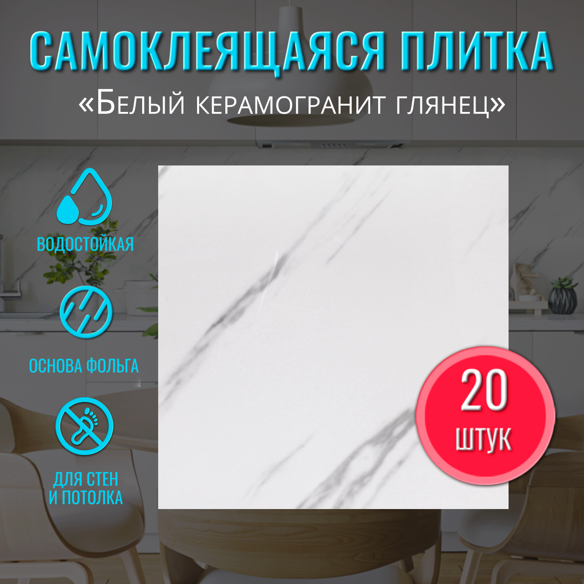 Плитка самоклеющаяся на стену "Белый керамогранит" 30х30 см 20 шт. влагостойкая моющаяся самоклеющаяся панель для стен декор вместо кухонного фартука под мрамор