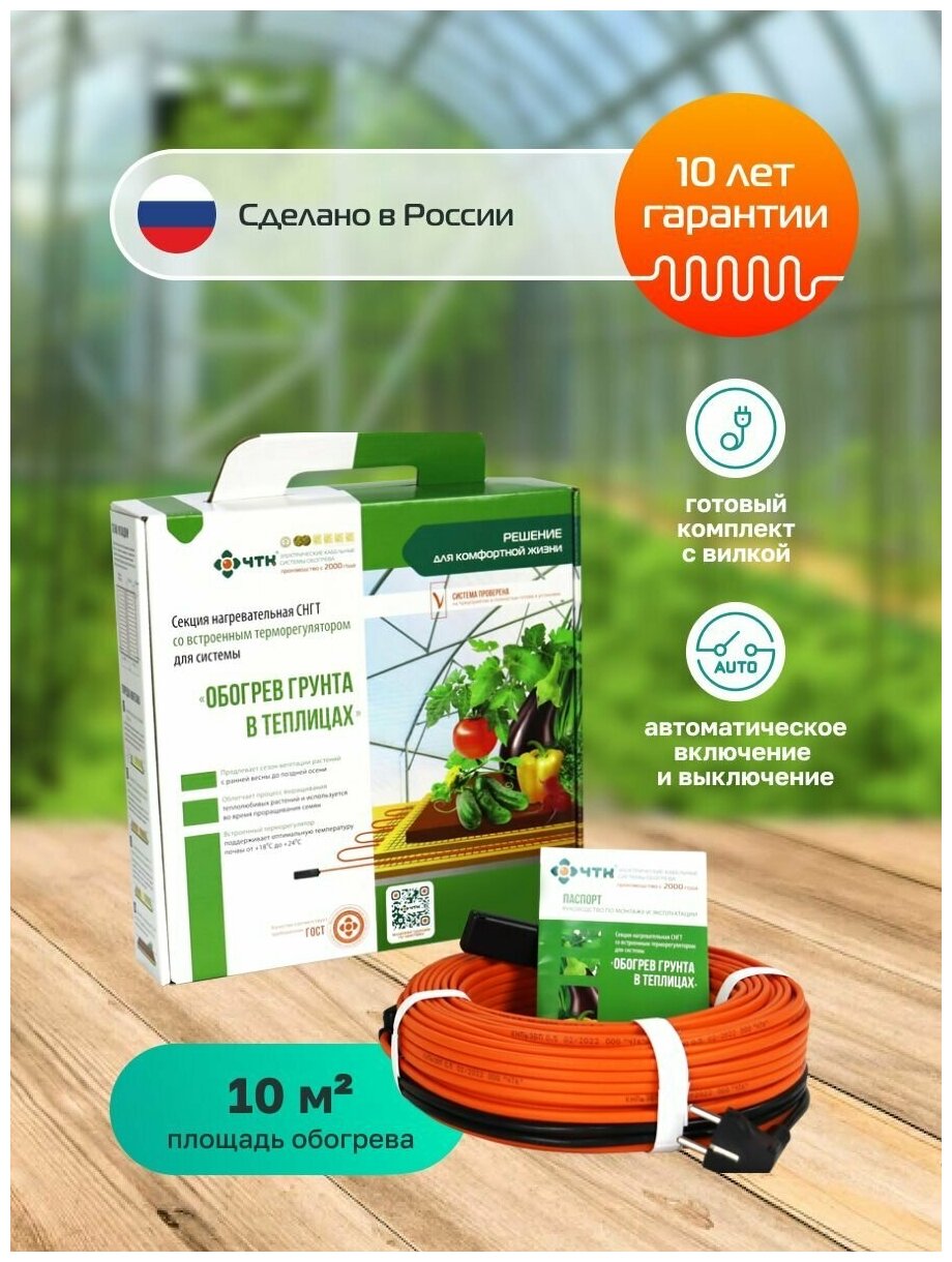 Греющий кабель ЧТК. Система обогрева грунта теплиц с термостатом снгт 10 кв. м. 1095 Вт. 73 м.