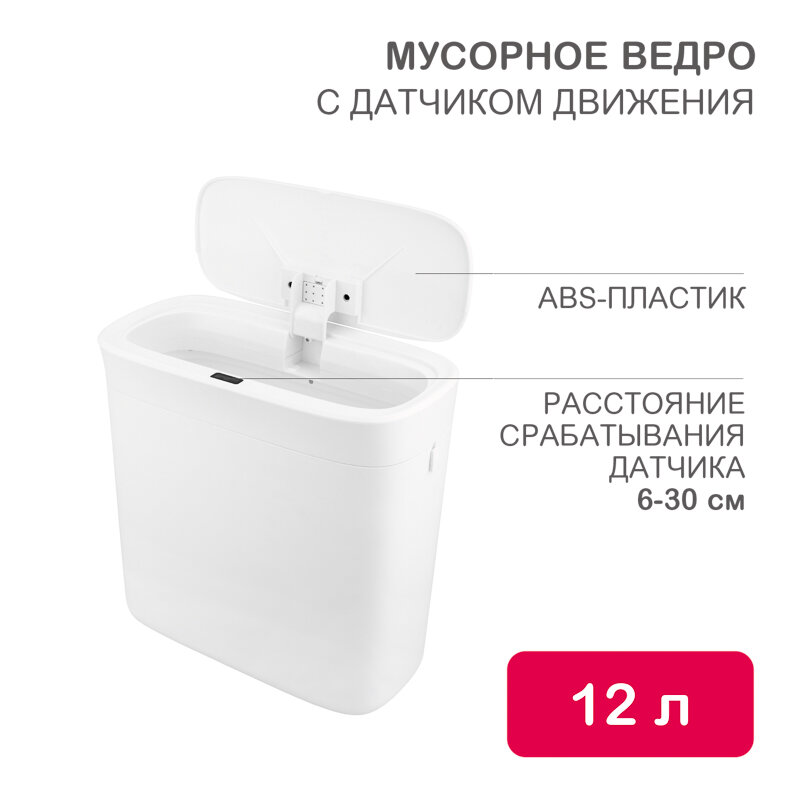 Ведро-контейнер сенсорное мусорное автоматическое для кухни/туалета/сбора отходов/дома/офиса с крышкой/индикатором разряда батареи и датчиком движения, объем 12 литров