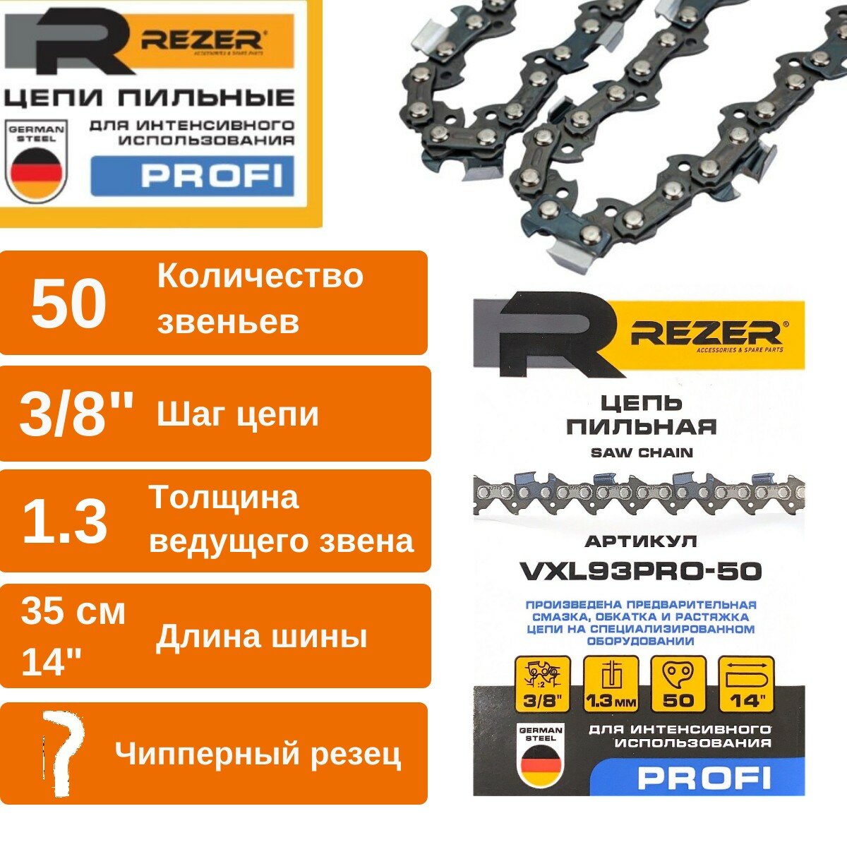 Купить Цепь пильная для пилы STIHL (Штиль) MS 170 / 180 / 210 / 230 / 250, 50 звеньев, Длина шины- 14"/35см, Шаг цепи - 3/8", Толщина ведущего звена - 1,3 мм , Зуб - Чиппер, REZER PROFI
