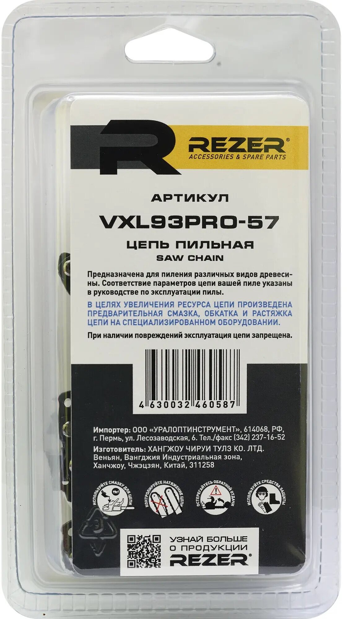 | Дополнительная информация | Цепь пильная Rezer VXL93PRO, 57 звеньев, шаг 3/8 дюйма, паз 1.3 мм |