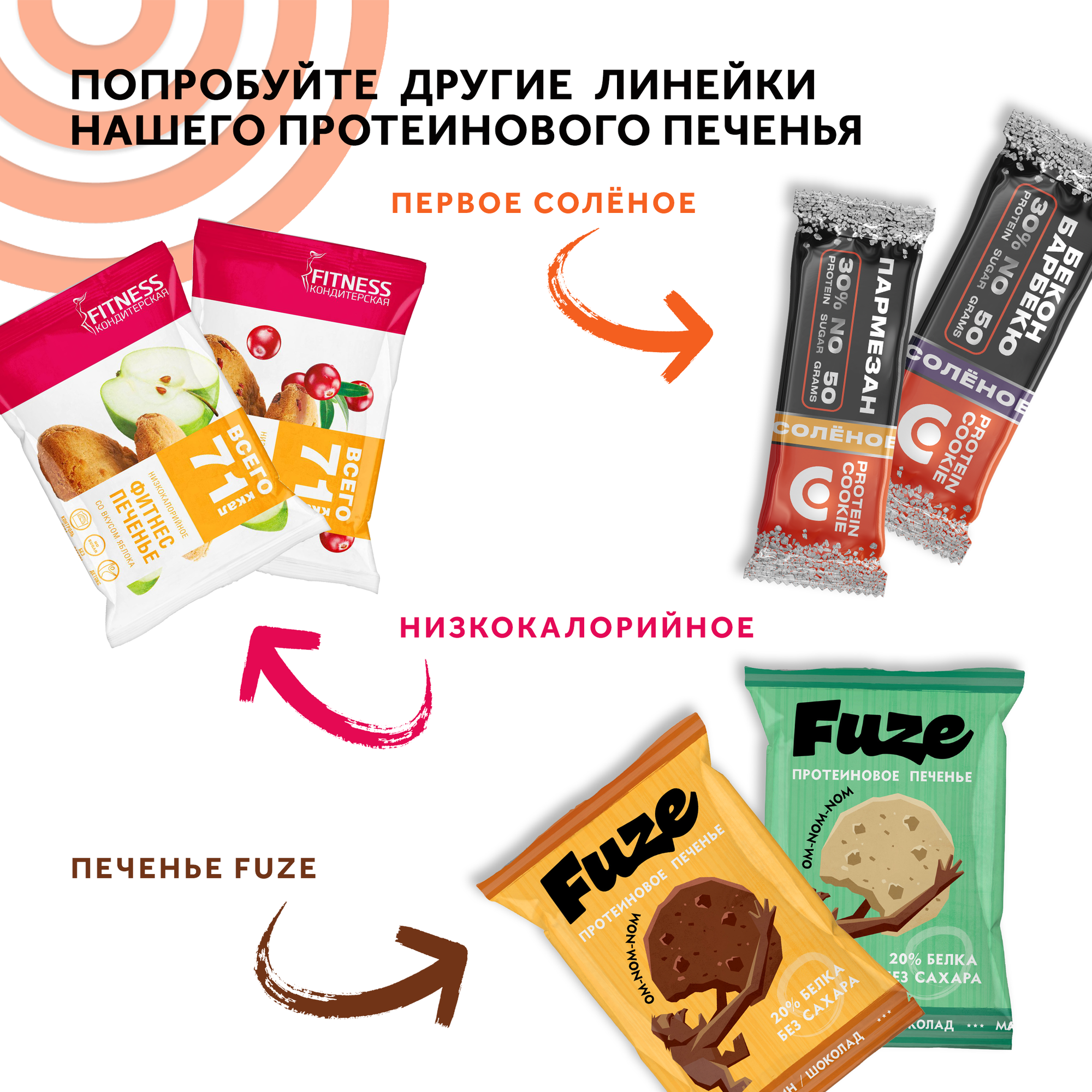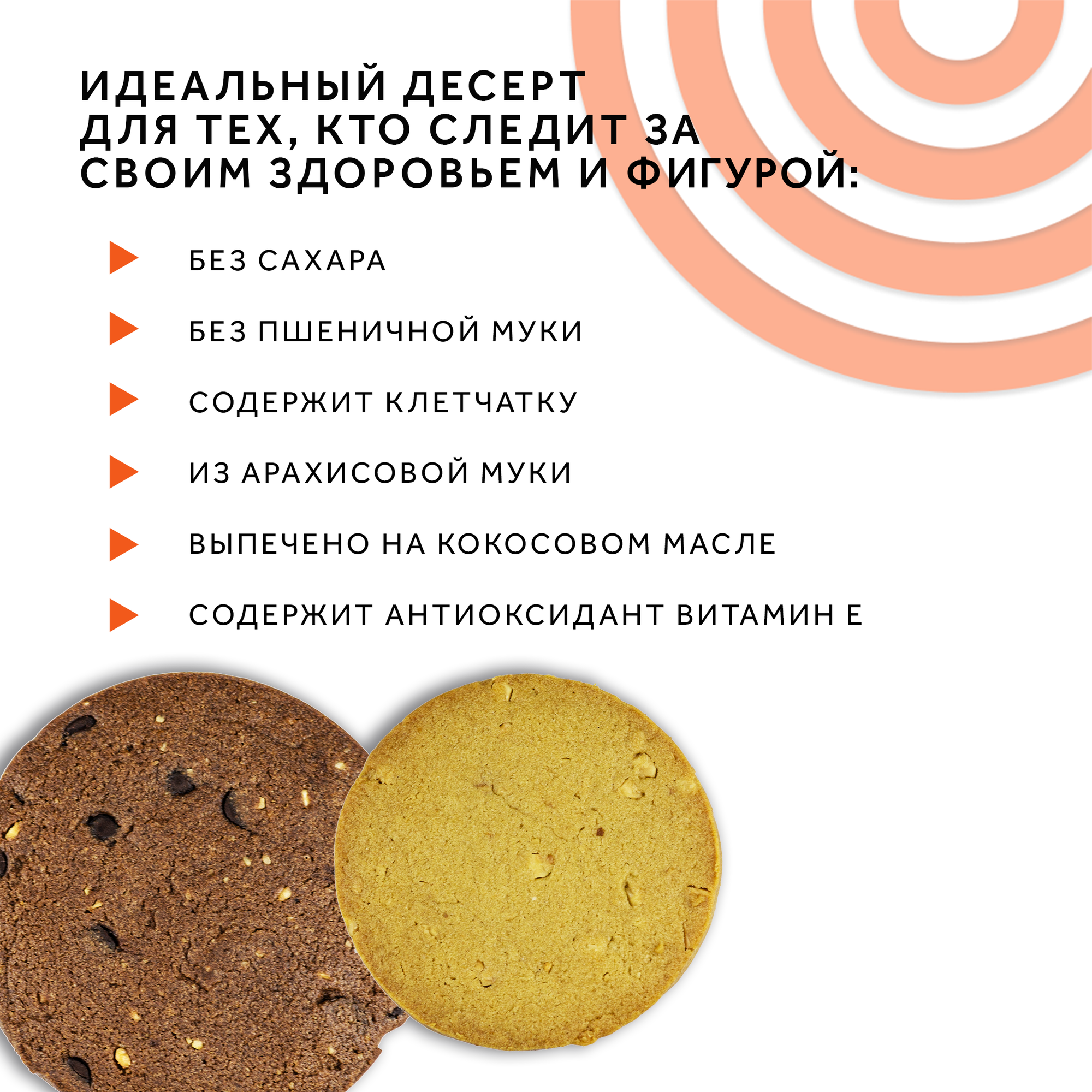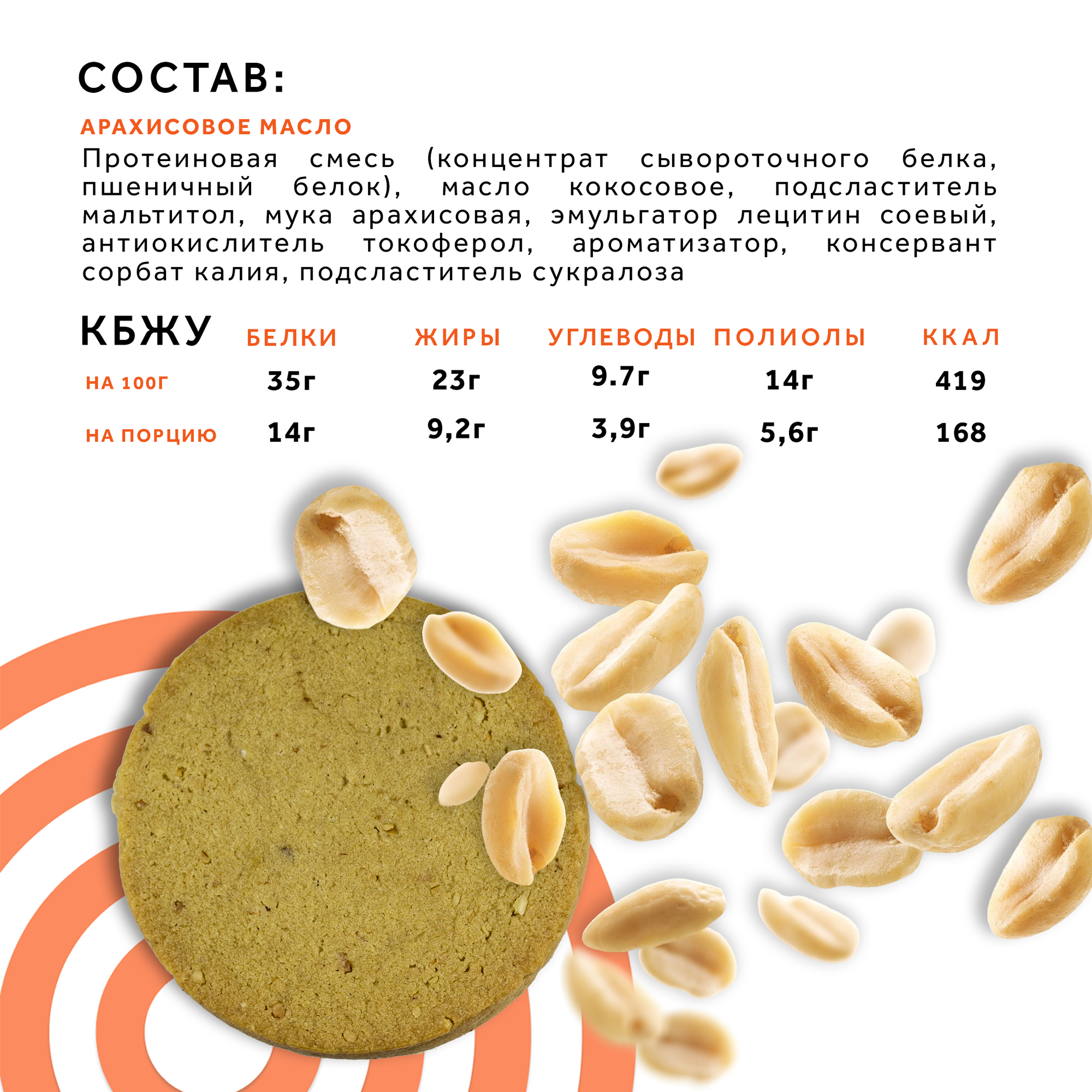 | Дополнительная информация | "Состав: Протеиновая смесь (концентрат сывороточного белка, пшеничный белок), масло кокосовое, подсластитель мальтитол, мука арахисовая, эмульгатор лецитин соевый, антиокислитель токоферол, ароматизатор, консервант сорбат калия, подсластитель сукралоза.Пищевая и энергетическая ценность на 100г: Белки 35г, жиры 23г, углеводы 9,7г, полиолы 14г, 419 ккал/1754 кДж/ на порцию: Белки 14г, жиры 9,2г, углеводы 3,9г, полиолы 5,6г, 168 ккал/703 кДж. Способ применения: Это печенье отлично разнообразит ваш рацион. 2 штуки в день заменят один прием пищи и обеспечат до 30% дневной потребности в белке* (*в зависимости от индивидуальных параметров)" |