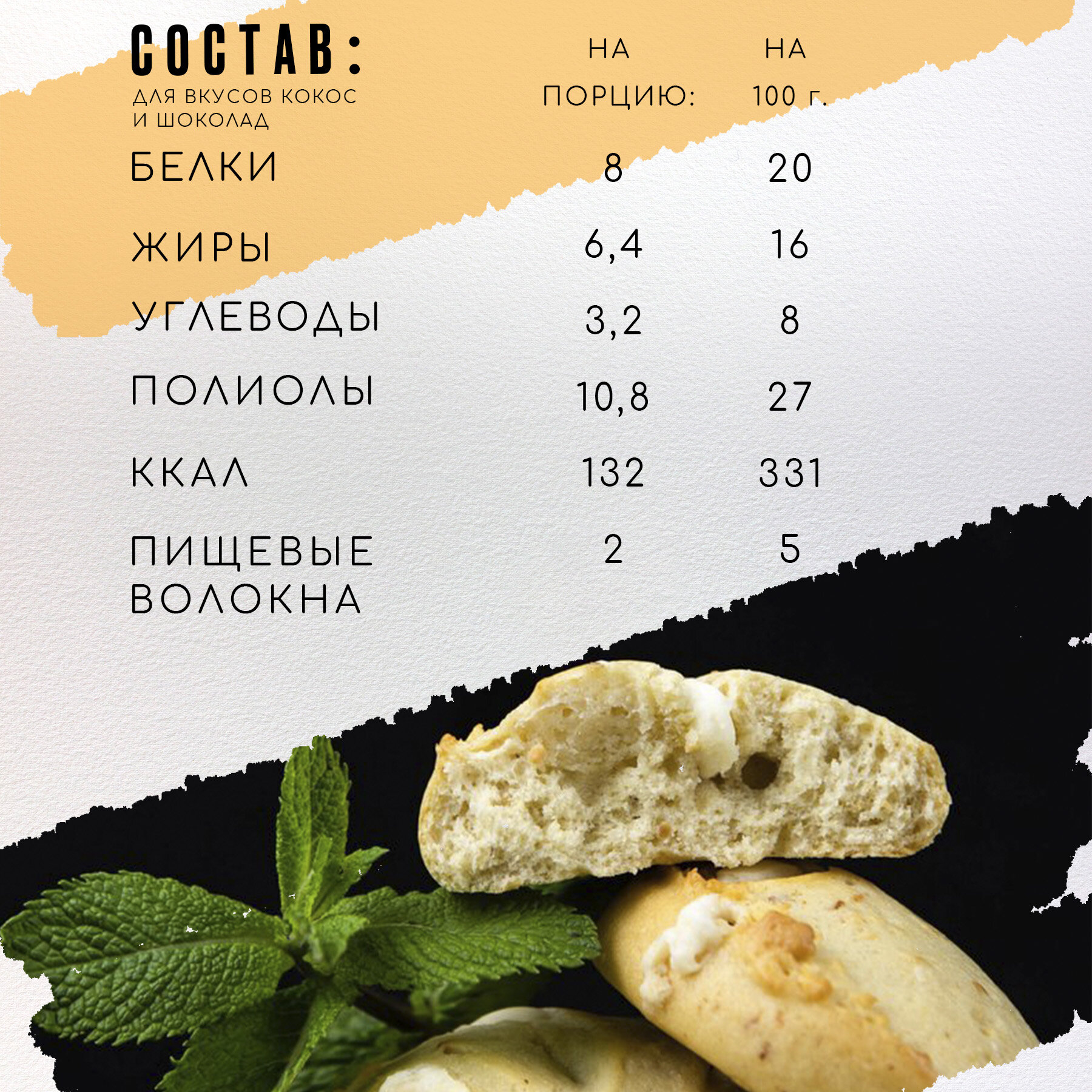 | Дополнительная информация | кокосовая мука, арахисовая мука, миндальная мука, обезжиренный какао порошок, орехи, желейно-мармеладные кусочки, кондитерская глазурь включаются в состав в зависимости от вкуса; при чрезмерном употреблении может оказывать слабительное действие; форма выпуска: печенье; состав: концентрат сывороточного белка, пшеничный белок, подсластитель мальтитол, яичный белок, клетчатка, смесь насыщенных и ненасыщенных жиров, разрыхлитель, ароматизатор, консерванты сорбат калия и бензоат натрия, подсластитель сукралоза |