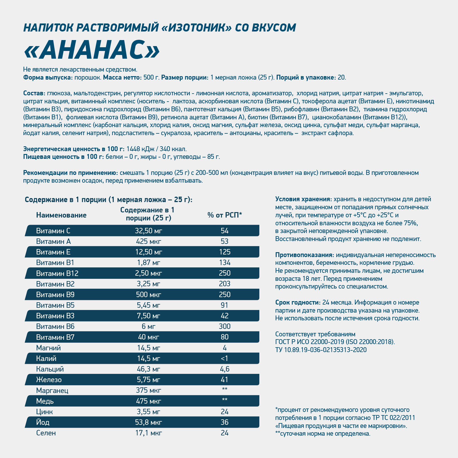 | Состав | мальтодекстрин, сахароза, декстроза, нутриоза, регуляторы кислотности: лимонная кислота, цитрат натрия, цитрат кальция; ароматизатор, хлорид натрия, бензоат натрия (консервант), витаминный премикс 10-14 (лактоза, аскорбиновая кислота (витамин С), токоферола ацетат (витамин Е), никотинамид (витамин В3), пиридоксина гидрохлорид (витамин В6), пантотенат кальция (витамин В5), рибофлавин (витамин В2), ретинола ацетат (витамин А), тиамина гидрохлорид (витамин В1), фолиевая кислота (витамин В9), биотин (витамин Н), цианокобаламин (витамин В12), минеральный премикс 4-14 (кальция карбонат, калия хлорид, магния оксид, железа сульфат, цинка оксид, меди сульфат, сульфат марганца, йодит калия, селенит натрия), сукралоза (подсластитель), краситель: зеленое яблоко R100 |