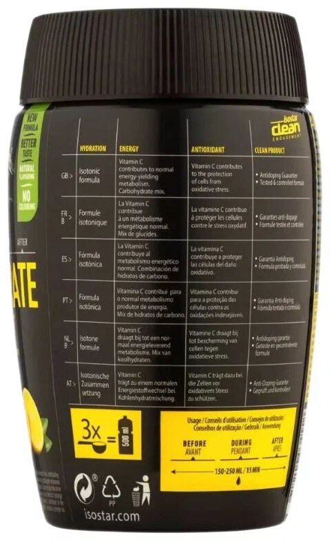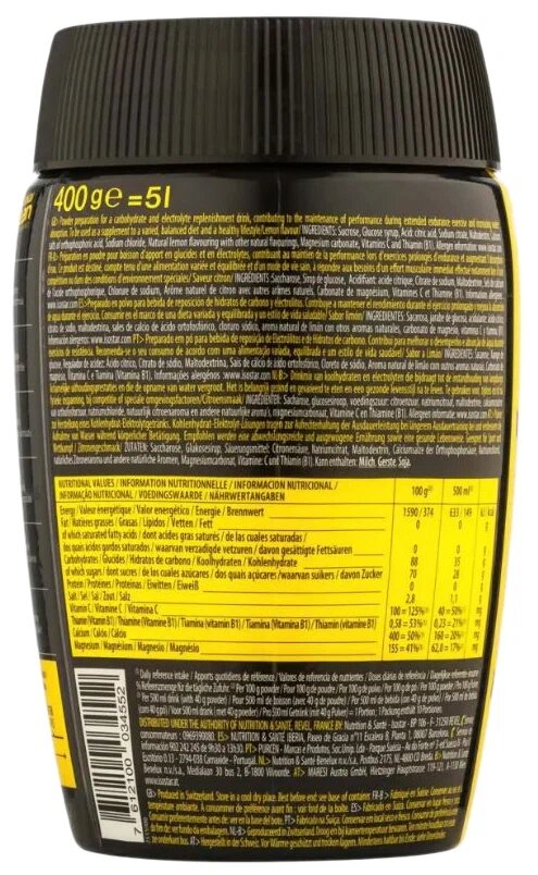 | Дополнительная информация | назначение: идеально подходит для интенсивных и объемных тренировок, особенно рекомендуется в теплую и жаркую погоду; рекомендации по применению: используйте во время разминки – 150 мл каждые 15 минут и во время упражнений 150-250 мл каждые 15 минут; вы можете начать пить за 3 дня до тренировки, чтобы оптимизировать гидратацию и хранение гликогена или за 3 часа до 1 часа 30 минут до тренировки, чтобы сохранить гидратацию и накопление энергии; состав: сахароза, глюкозный сироп, подкислитель: лимонная кислота, цитрат натрия, мальтодекстрин, натуральный ароматизатор, кальциевые соли ортофосфорной кислоты, хлорид натрия, карбонат магния, витамины c и тиамин (b1); сделано в мастерской, в которой используются: соя, молочный белок, глютен |