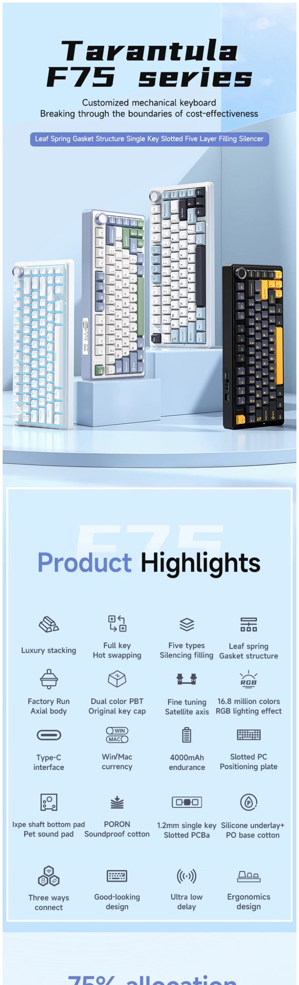 Механическая игровая клавиатура AULA F75, Glacier Blue, LEOBOG Reaper Axis