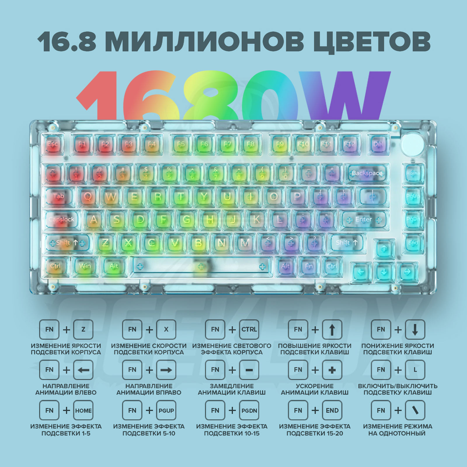 Механическая беспроводная прозрачная клавиатура Monsgeek ICE 75, 75%, Hotswap, RGB, Русская раскладка,голубой
