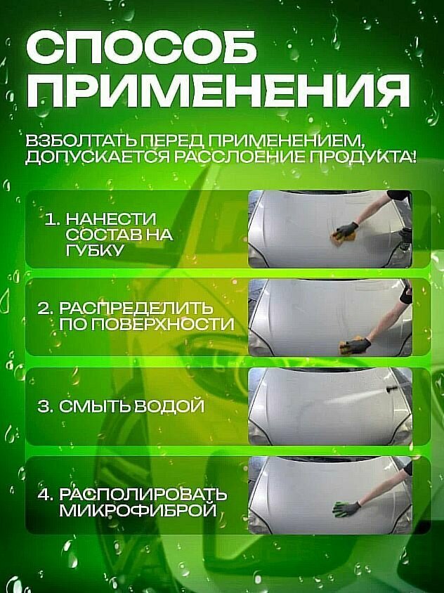 | Действие | водоотталкивающий эффект, заполняет мелкие царапины, защищает ЛКП, защищает от ультрафиолета, придает блеск |