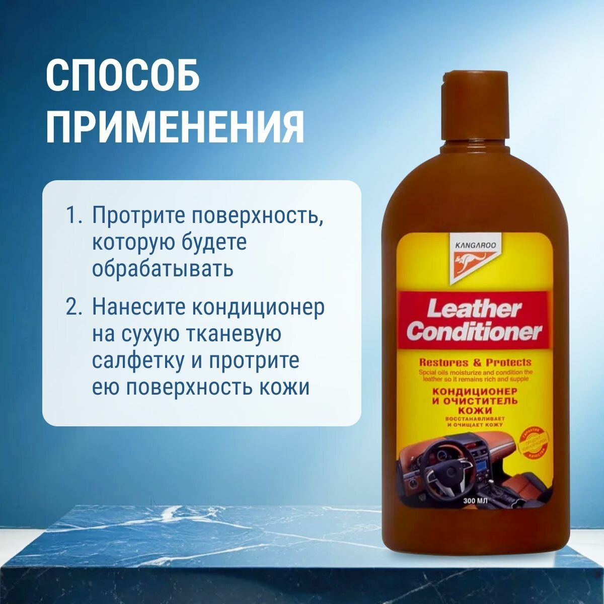 | Способ применения | вытрите пыль и грязь с поверхности, которую будете обрабатывать. Нанесите кондиционер на сухую и чистую тканевую салфетку и протрите ею поверхность кожи. Не наносите кондиционер непосредственно на кожу. Сначала попробуйте средство на незаметном участке, чтобы убедиться, что цвет кожи не меняется, и она не покрывается пятнами. Не используйте данное средство на коже с ворсом, такой как замша |