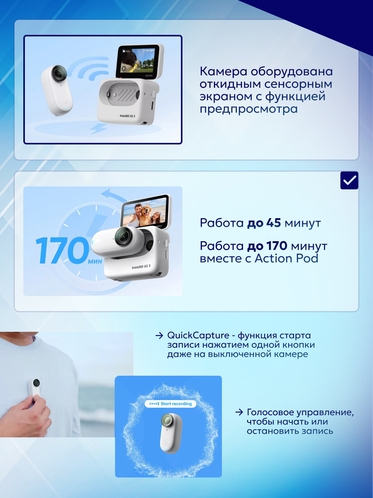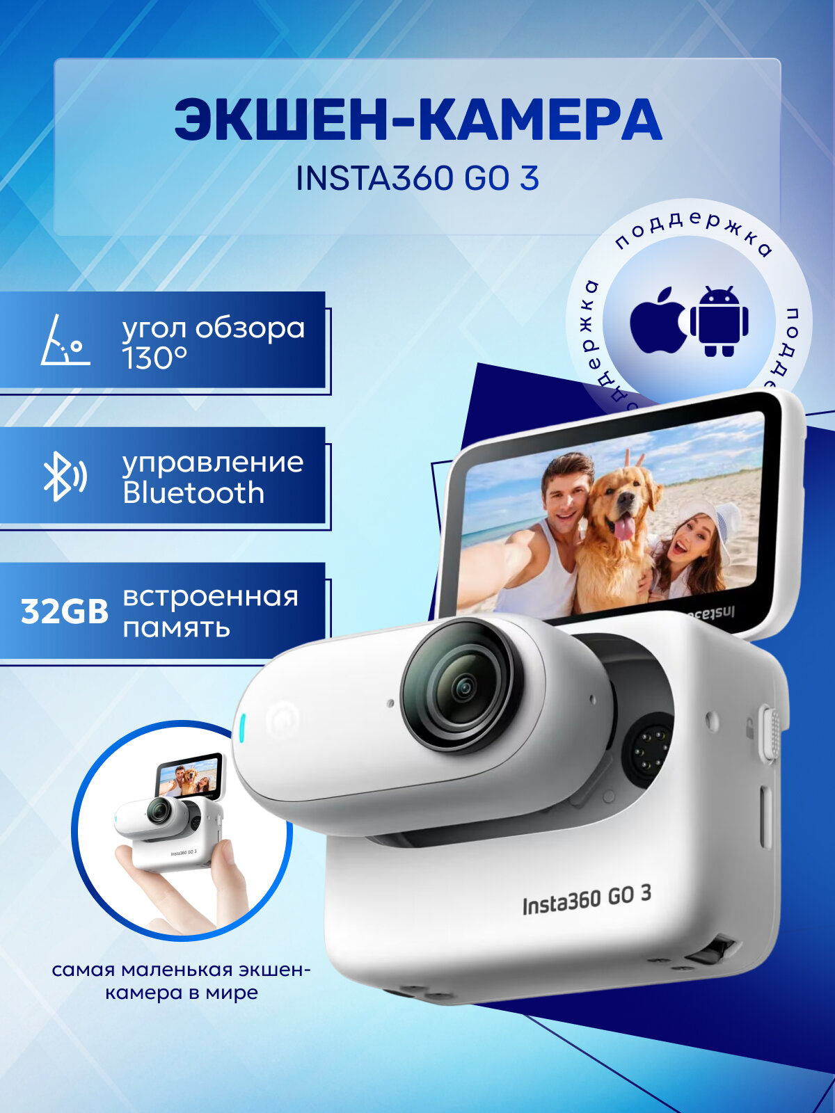 Экшн-камера Insta360 GO 3, 128ГБ, 2.7К, цифровой стабилизатор, Wi-Fi, Bluetooth 5.0, Белый интересное: