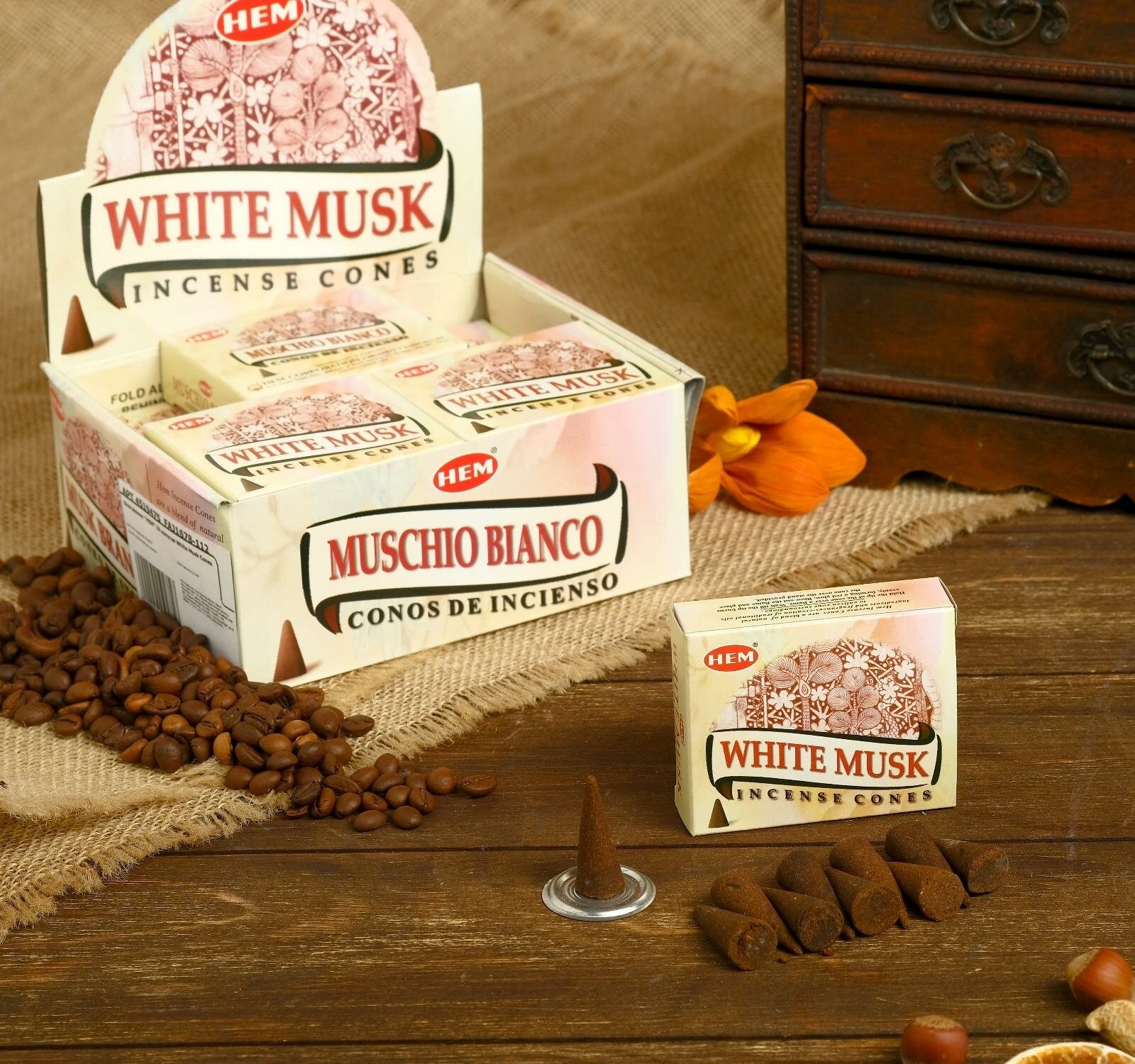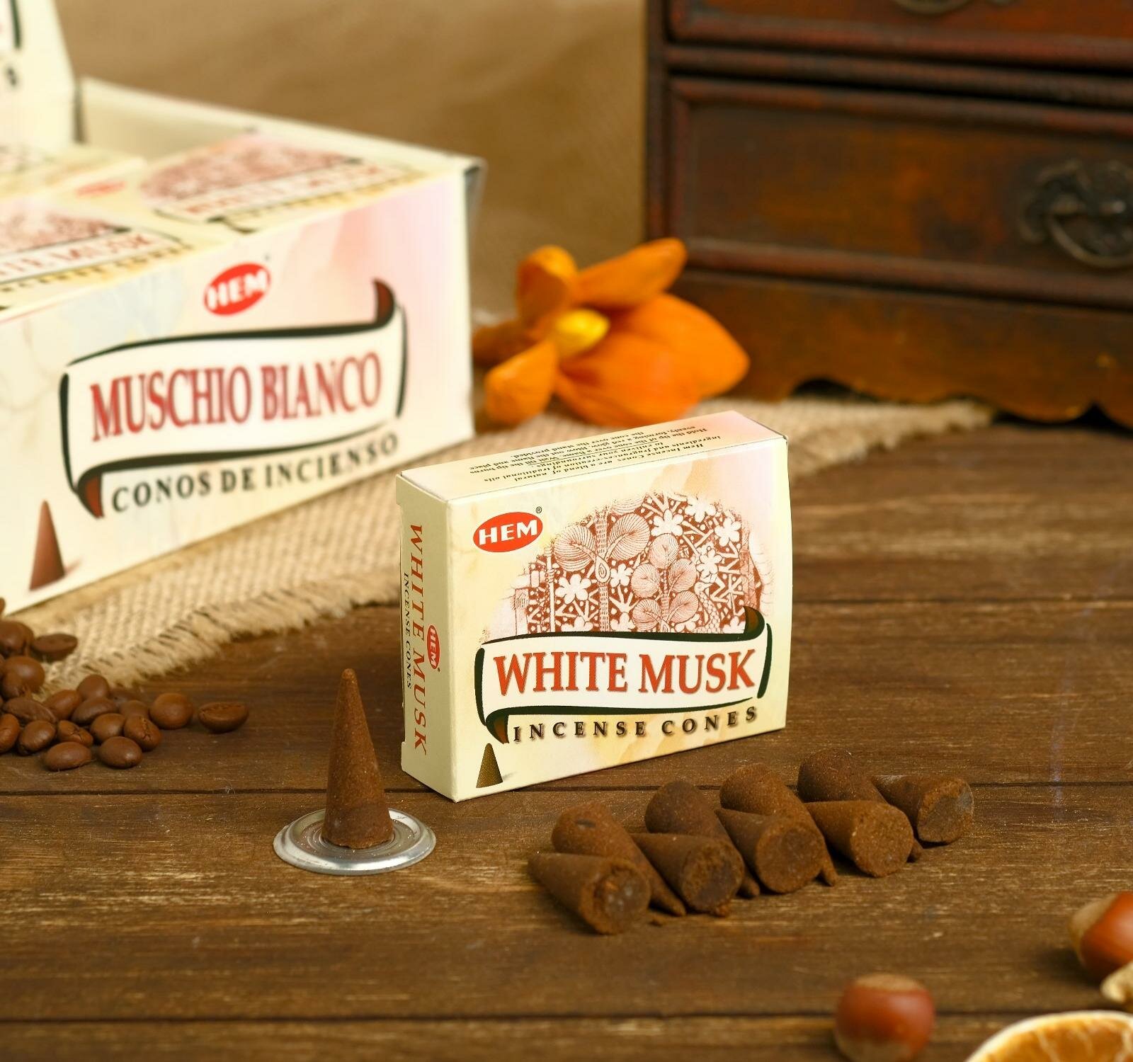Благовония HEM 10 конусов, White Musk Cones, дерево