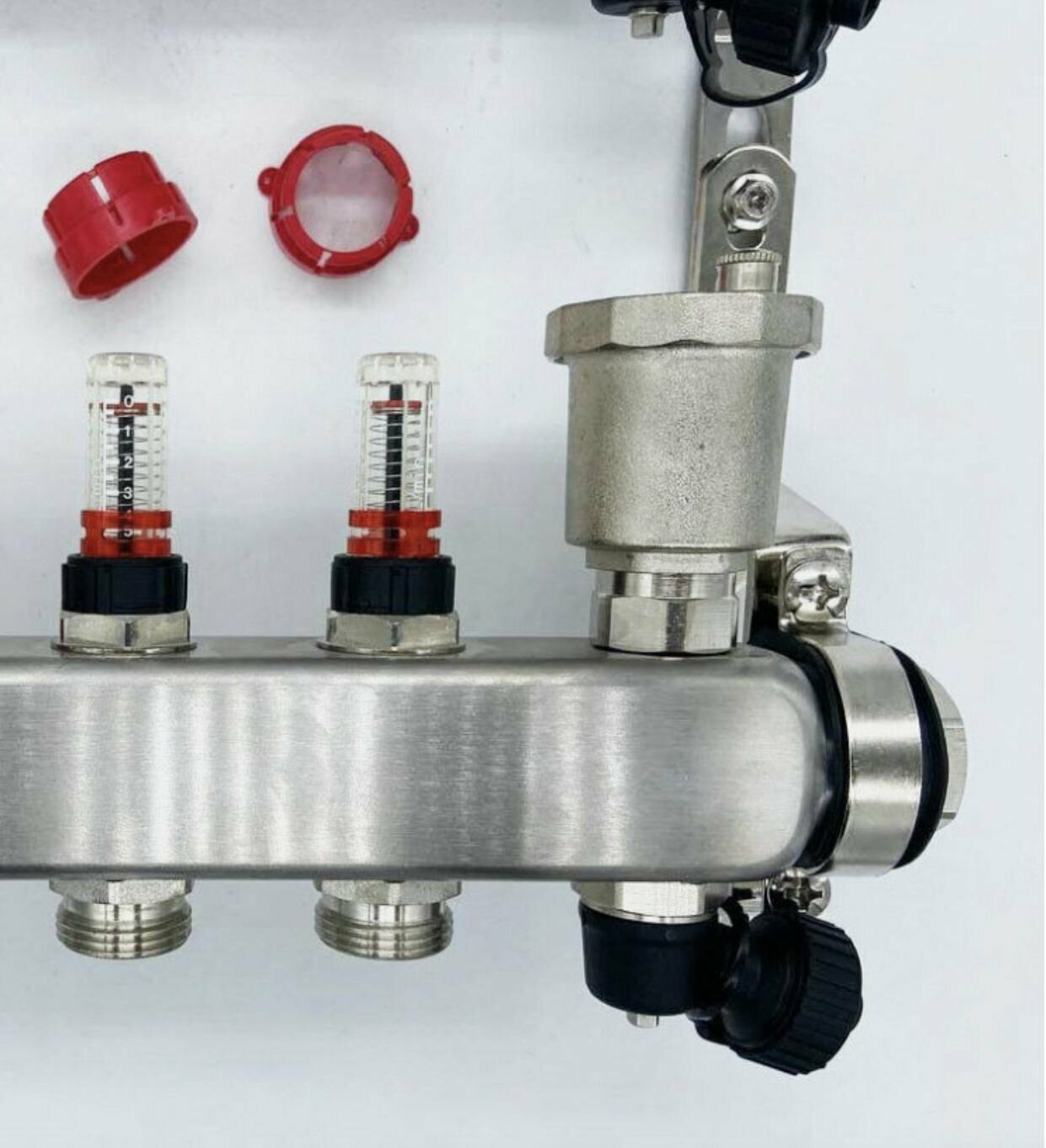 | Подробная комплектация | Коллекторная группа состроит из: Напорный коллектор с расходомерами - 1 шт. Обратный коллектор с запорными вентилями - 1 шт. Дренажные клапаны - 2 шт. Автоматический воздухоотводчик - 2 шт. Цельнометаллический кронштейн - 2 шт. Заглушки - 2 шт. |