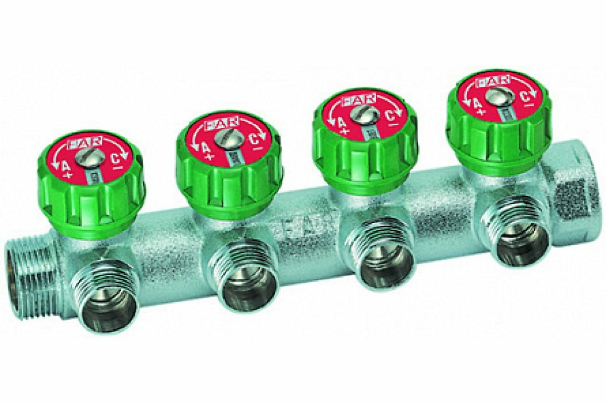 Коллектор регулирующий проходной FAR Multifar размером 1", кол-во отводов 4 шт., резьба на отводах 3/4" под Евроконус