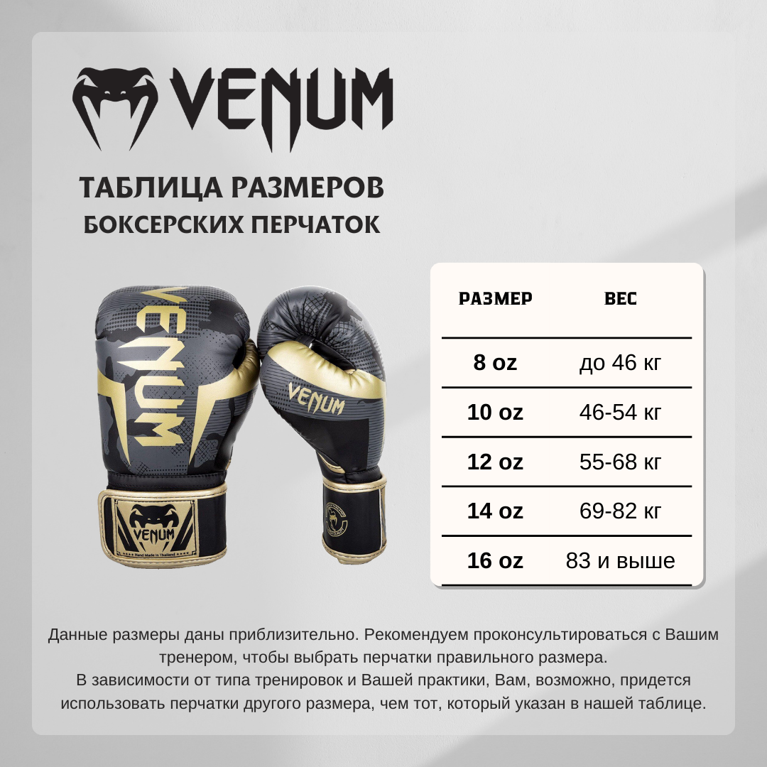 СохранитьПерчатки боксерские Venum Elite камуфляж/золото, вес 10 унций интересное: