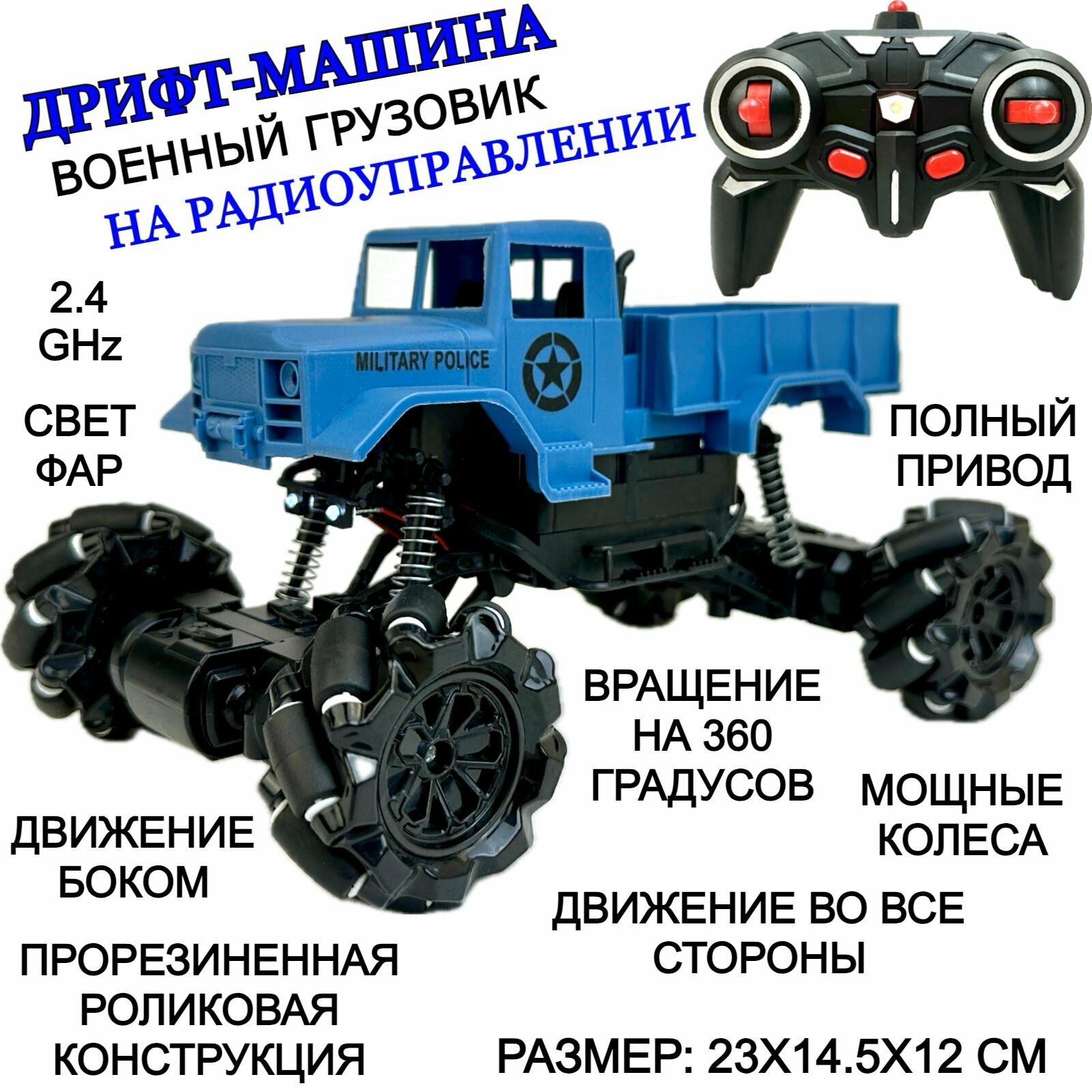 Радиоуправляемый военный грузовик, краулер движется во всех направлениях, машинка на пульте управления, дрифт, вращение 360, свет фар, на радиоуправл