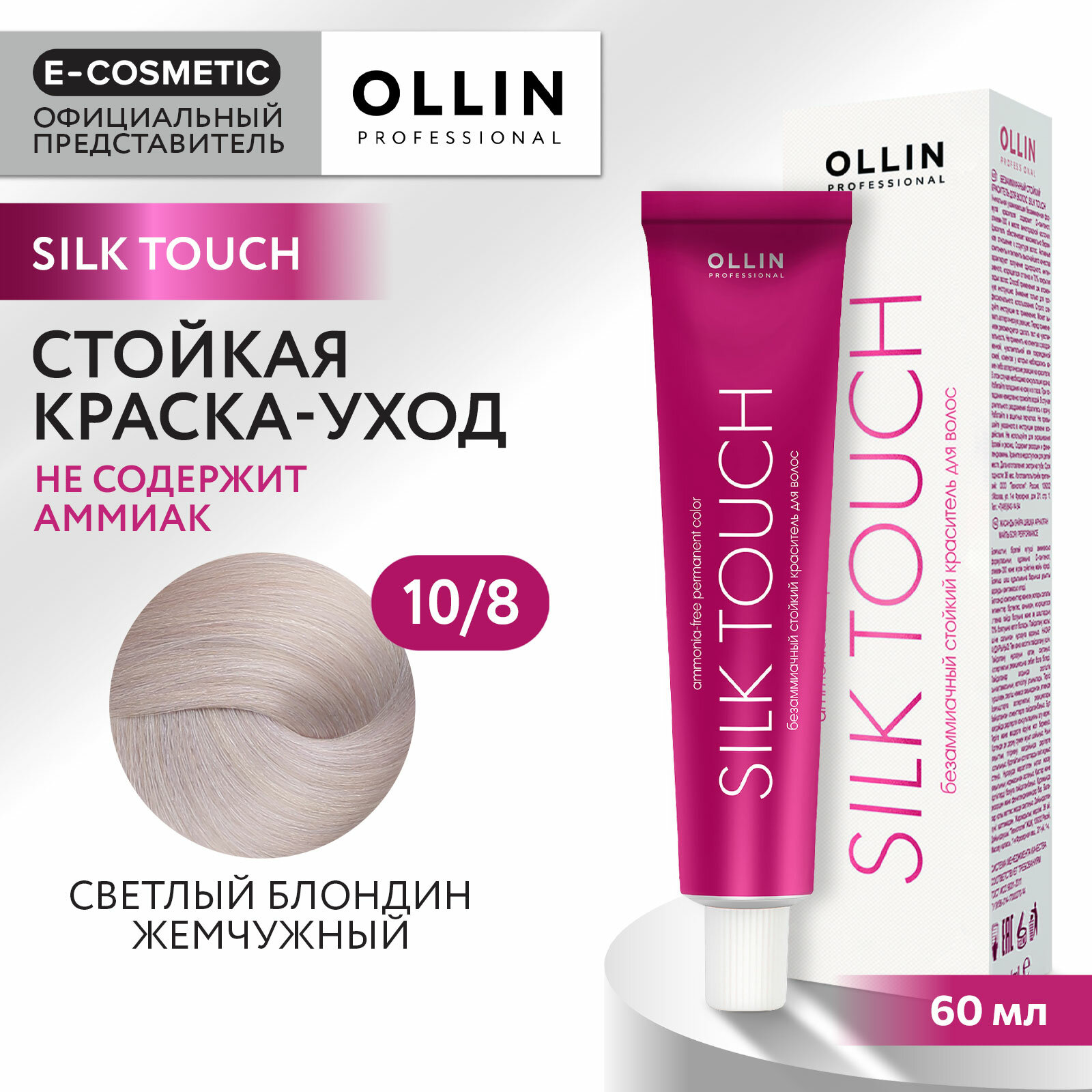 OLLIN Professional Silk Touch стойкий краситель для волос безаммиачный, 10/8 светлый блондин жемчужный, 60 мл