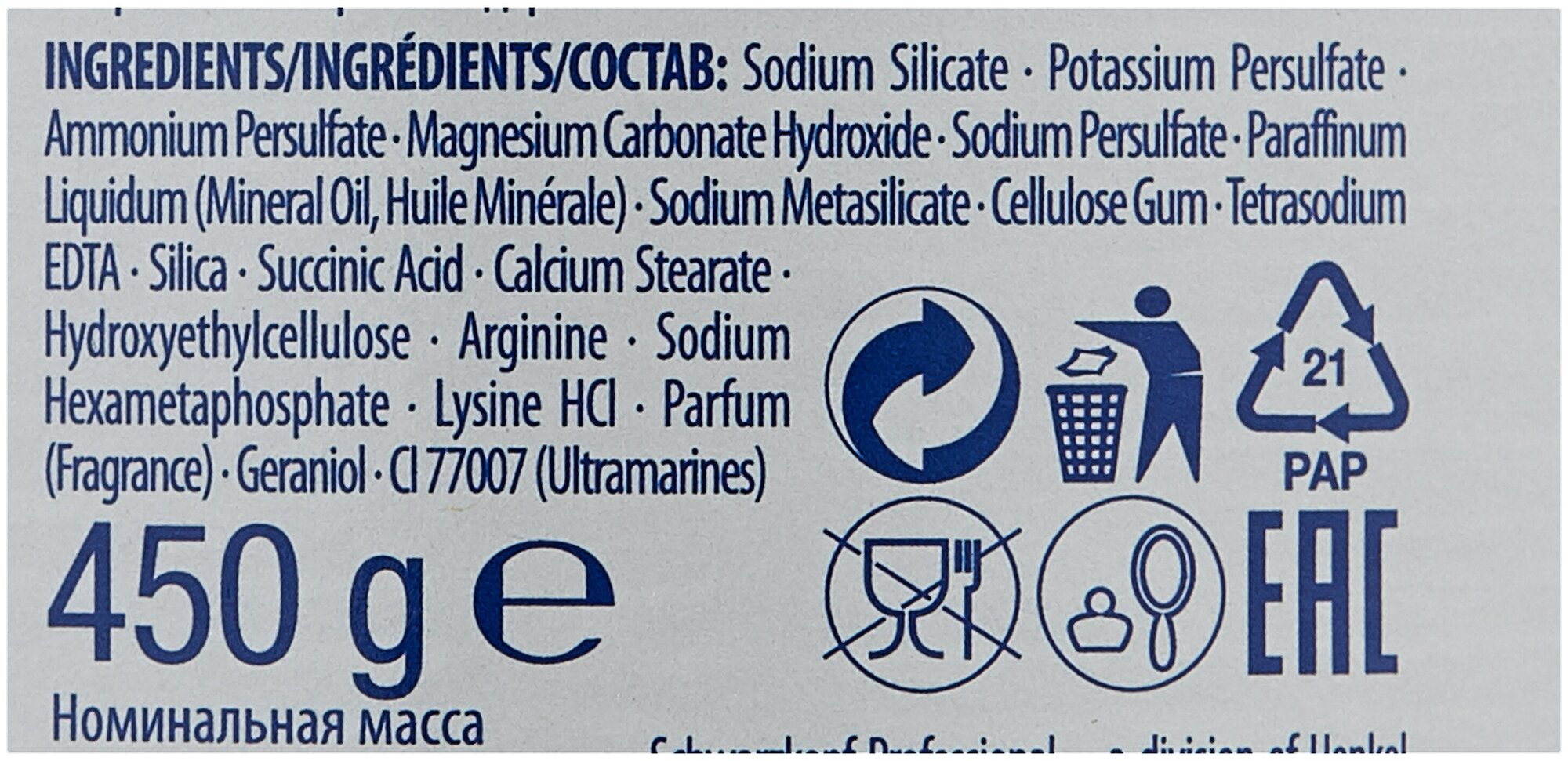 | Состав | sodium silicate, potassium persulfate, ammonium persulfate, magnesium carbonate hydroxide, sodium persulfate, paraffinum liquidum (mineral oil, huile minerale), sodium metasilicate, cellulose gum, tetrasodium EDTA, silica, succinic acid, calcium stearate, hydroxyethylcellulose, arginine, sodium hexametaphosphate, lysine HCI, parfum (fragrance), geraniol, CI 77007 (ultramarines) |