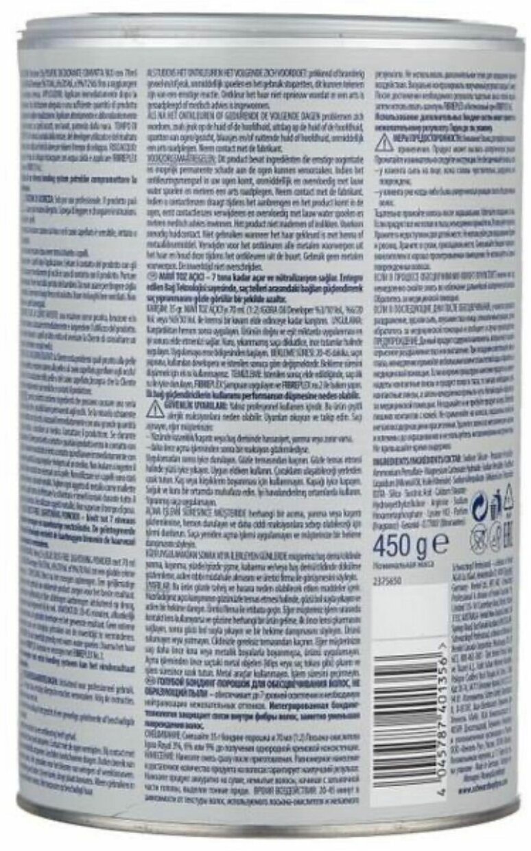 | Способ применения | Наносите продукт сразу после смешивания. Наилучший результат будет достигнут при качественном распределении и достаточном количестве продукта. Наносите обильно, выделяя тонкие пряди, работайте на сухих естественно загрязненных волосах, начните нанесение с затылочной зоны. Время выдержки: 20-45 минут, в зависимости от текстуры волос, используемого окислителя и желаемого результата. В течение всего времени воздействия контролируйте процесс осветления. Не используйте дополнительное тепло для сокращения времени воздействия. |