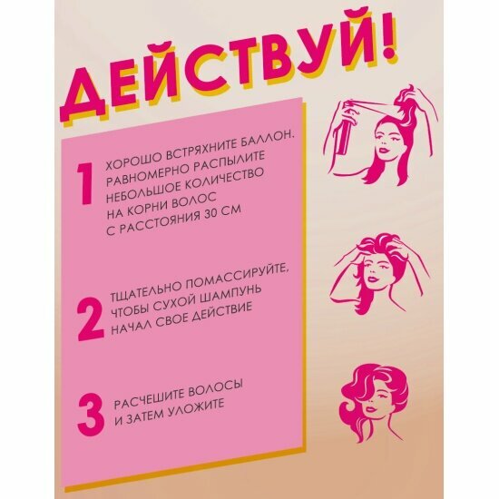 | Способ применения | Чтобы волосы выглядели «как после душа», нужно распылить с расстояния 30 см на корни, далее подождать три минуты, затем помассировать голову у и тщательно расчесать волосы. Если же вы просто хотите освежить укладку, которую нельзя расчесывать, то после использования можно сдуть остатки шампуня феном в режиме холодного ветерка. |