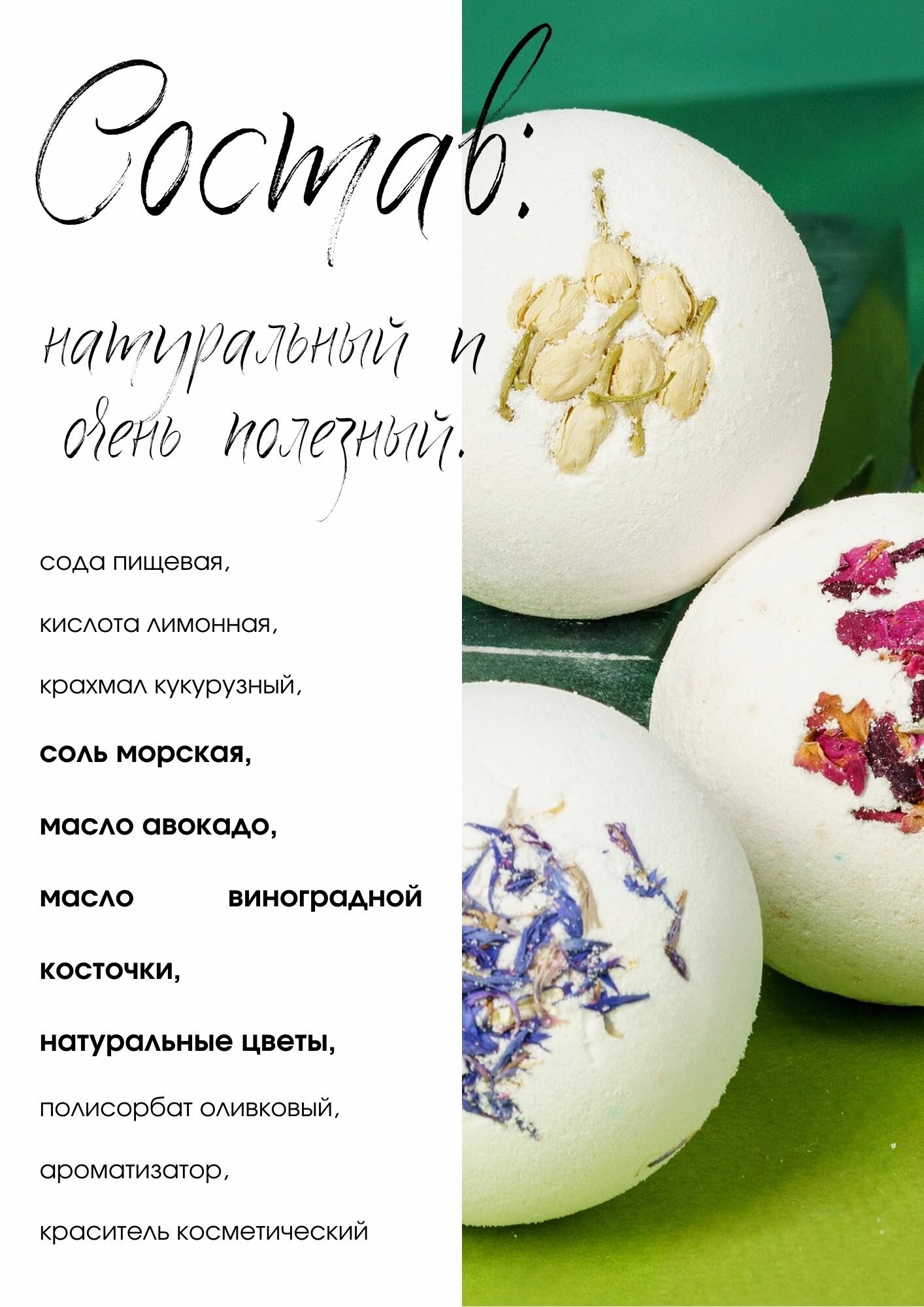 | Состав | сода пищевая, кислота лимонная, крахмал кукурузный, соль морская, масло авокадо, масло виноградной косточки, полисорбат оливковый, ароматизатор, краситель косметический |