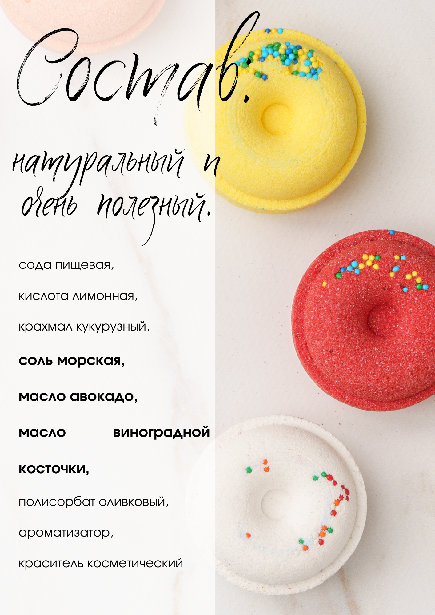 | Состав | Морская соль, сода пищевая, кислота лимонная, крахмал кукурузный, оливковый полисорбат, масло авокадо, масло оливы, краситель, ароматизатор. |