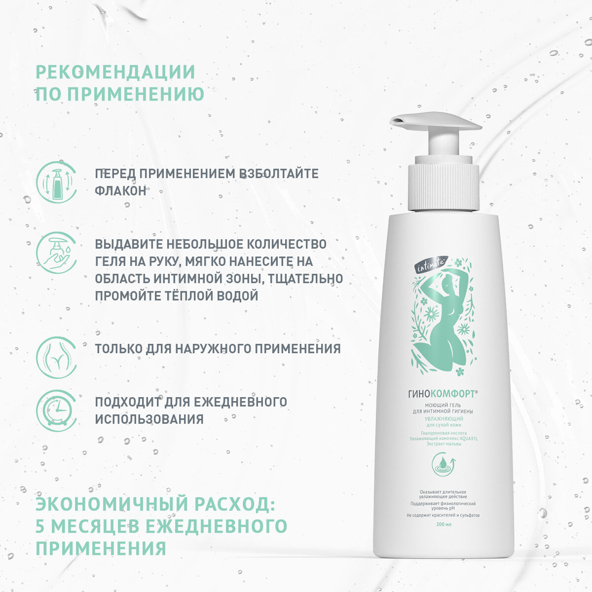 | Способ применения | Перед применением флакон следует взболтать. Выдавить небольшое количество геля на руку или губку, мягко нанести на область интимной зоны Тщательно промыть тёплой водой. Подходит для постоянного применения. |