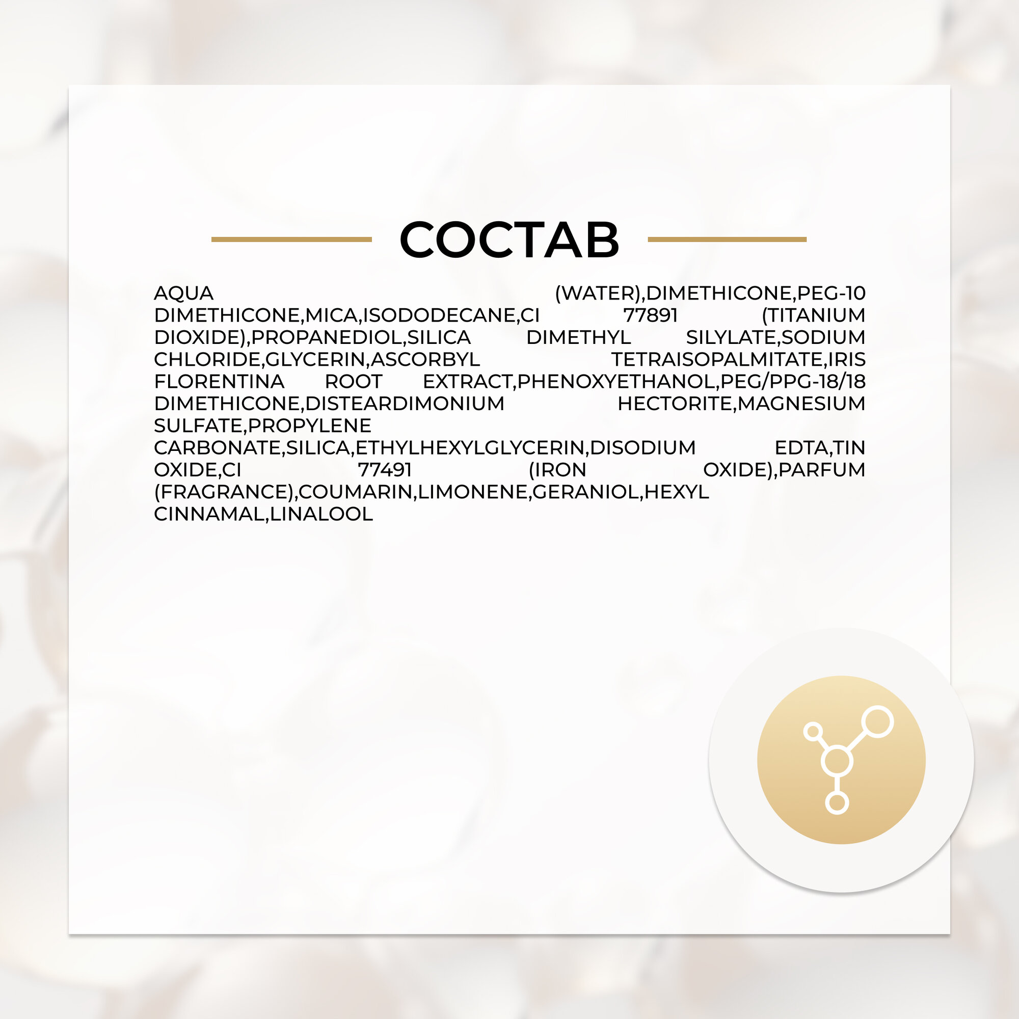 | Состав | Aqua (Water),Dimethicone,PEG-10 Dimethicone,Mica,Isododecane,CI 77891 (Titanium Dioxide),Propanediol,Silica Dimethyl Silylate,Sodium Chloride,Glycerin,Ascorbyl Tetraisopalmitate,Iris Florentina Root Extract,Phenoxyethanol,PEG/PPG-18/18 Dimethicone,Disteardimonium Hectorite,Magnesium Sulfate,Propylene Carbonate,Silica,Ethylhexylglycerin,Disodium EDTA,Tin Oxide,CI 77491 (Iron Oxide),Parfum (Fragrance),Coumarin,Limonene,Geraniol,Hexyl Cinnamal,Linalool |