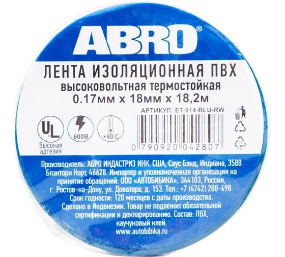 Ниже Вы можете прочитать отзывы на ABRO ET-914-BLU-R Изолента 18 мм х 18,3 м термостойкая синяя Abro, ознакомится с подробными характеристиками, посмотреть интересные обзоры и фотографии на ABRO ET-914-BLU-R Изолента 18 мм х 18,3 м термостойкая синяя Abro.
