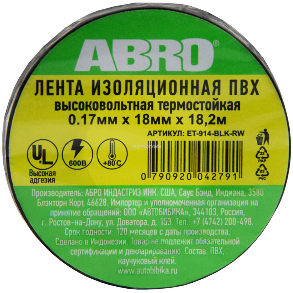 Изолента ABRO черная термостойкая 80С ET-914, ET914 ABRO ET-914