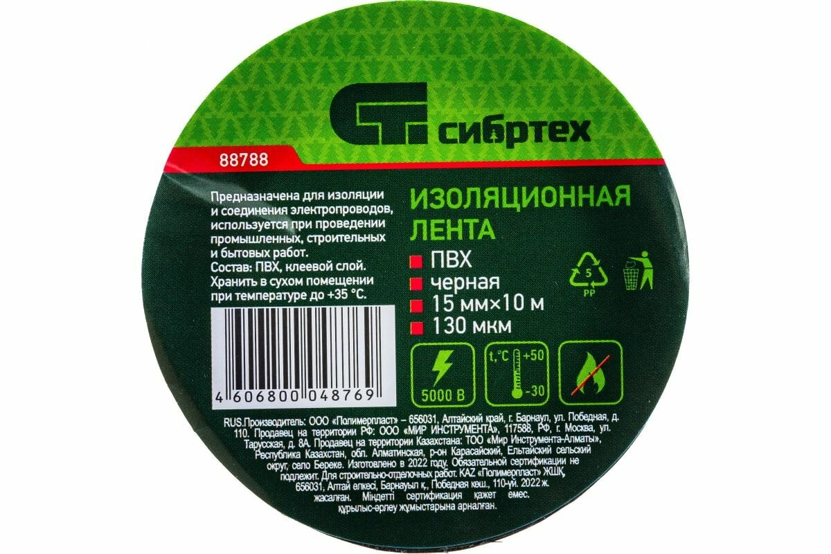 Изолента СИБРТЕХ ПВХ, 19 мм х 20 м, 130 мкм, черная 88794