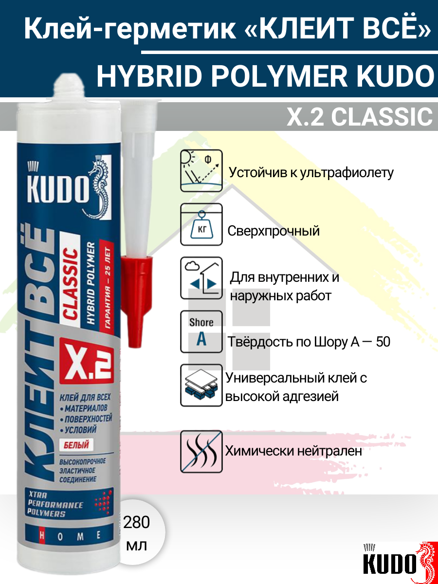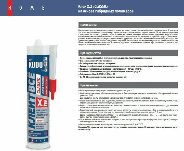 | Дополнительная информация | Преимущества Преимущества гибридного клея KUDO КЛЕИТ ВСЁ CLASSIC Устойчив к ультрафиолету Устойчив к УФ-излучению, воздействию чистящих и моющих средств Преимущества гибридного клея KUDO КЛЕИТ ВСЁ CLASSIC Сверхпрочный Превосходная адгезия без грунтования к большинству строительных материалов Преимущества гибридного клея KUDO КЛЕИТ ВСЁ CLASSIC Для внутренних и наружных работ Широкий температурный диапазон эксплуатации: от –60°С до +100°С Преимущества гибридного клея KUDO КЛЕИТ ВСЁ CLASSIC Твёрдость по Шору А — 50 На протяженни всего срока службы остается эластичным и деформационно подвижным Преимущества гибридного клея KUDO КЛЕИТ ВСЁ CLASSIC Универсальный клей с высокой адгезией Для поддонов, напольных плинтусов, молдингов, наличников, откосов, плитки, мозаики и д.р. Преимущества гибридного клея KUDO КЛЕИТ ВСЁ CLASSIC Химически нейтрален Без запаха, экологически безопасен. На основе гибридных полимеров XPP® Technology |