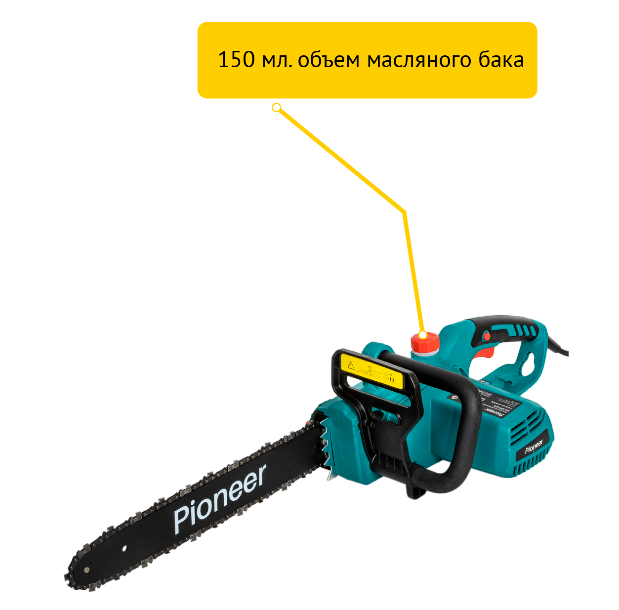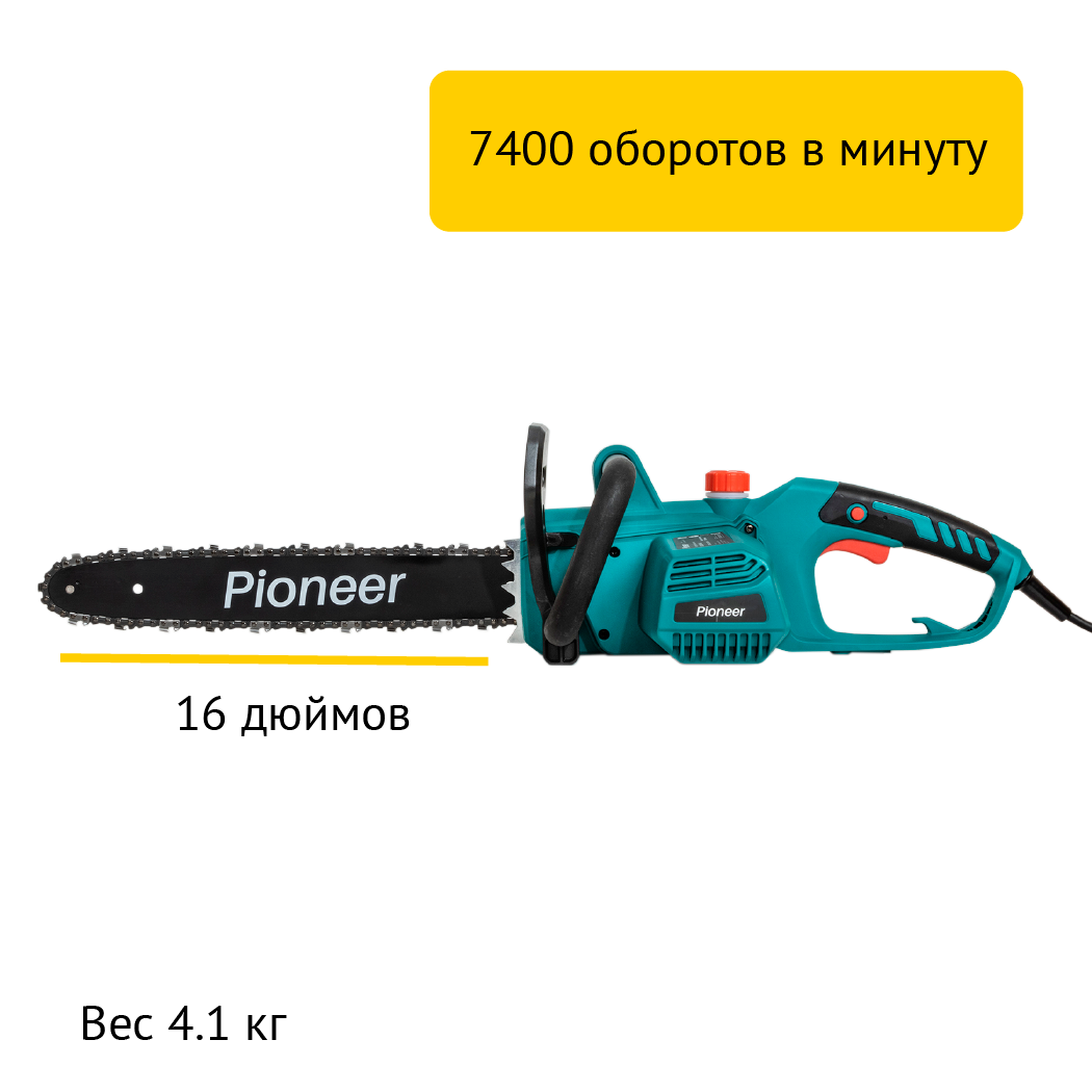 Пила цепная электрическая Pioneer ECS-2200-16HS с щеточным двигателем, бесключевая регулировка натяжения, быстрая замена щеток, автоподача масла, монтажный набор в комплекте, 7400 об/мин, 2200 Вт
