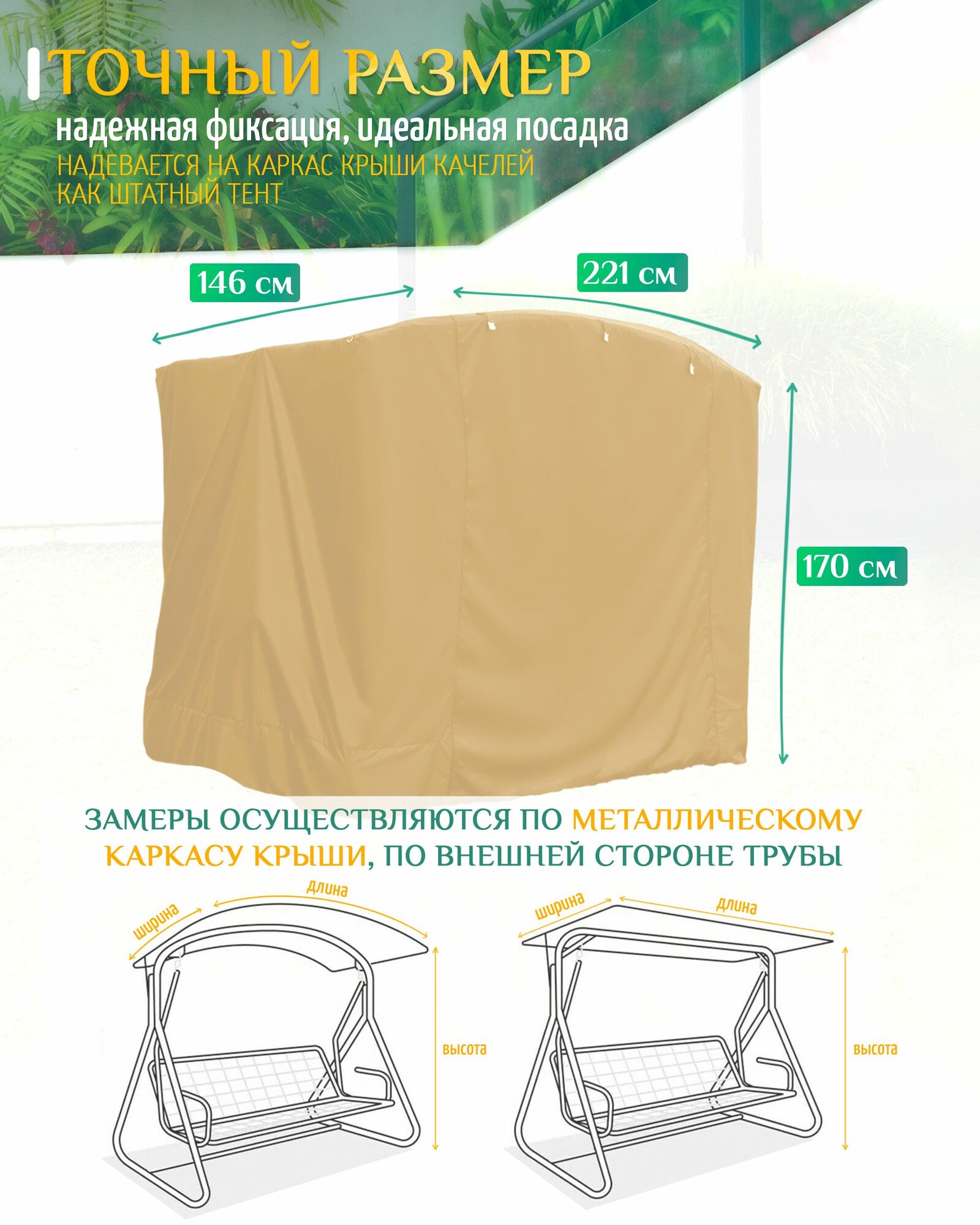 | Дополнительная информация | Укрывной чехол от дождя для садовых качелей из уплотненной водооталкивающей ткани Оксфорд 240D |