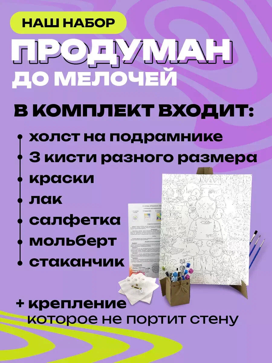 | Комплектация | -Холст на подрамнике -набор акриловых красок -3 кисти разного размера -настенное крепление -салфетки -подробная инструкция -схема картины в электронном виде по QR-коду -авторская коробка (подставка-мольберт и стаканчик) |