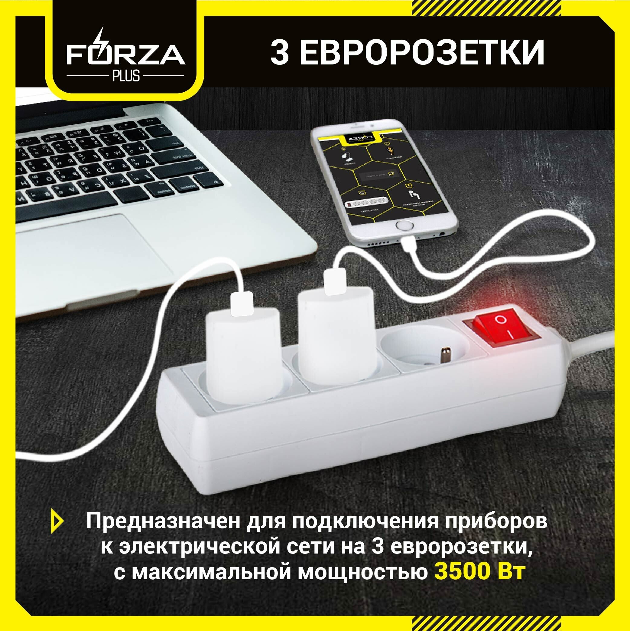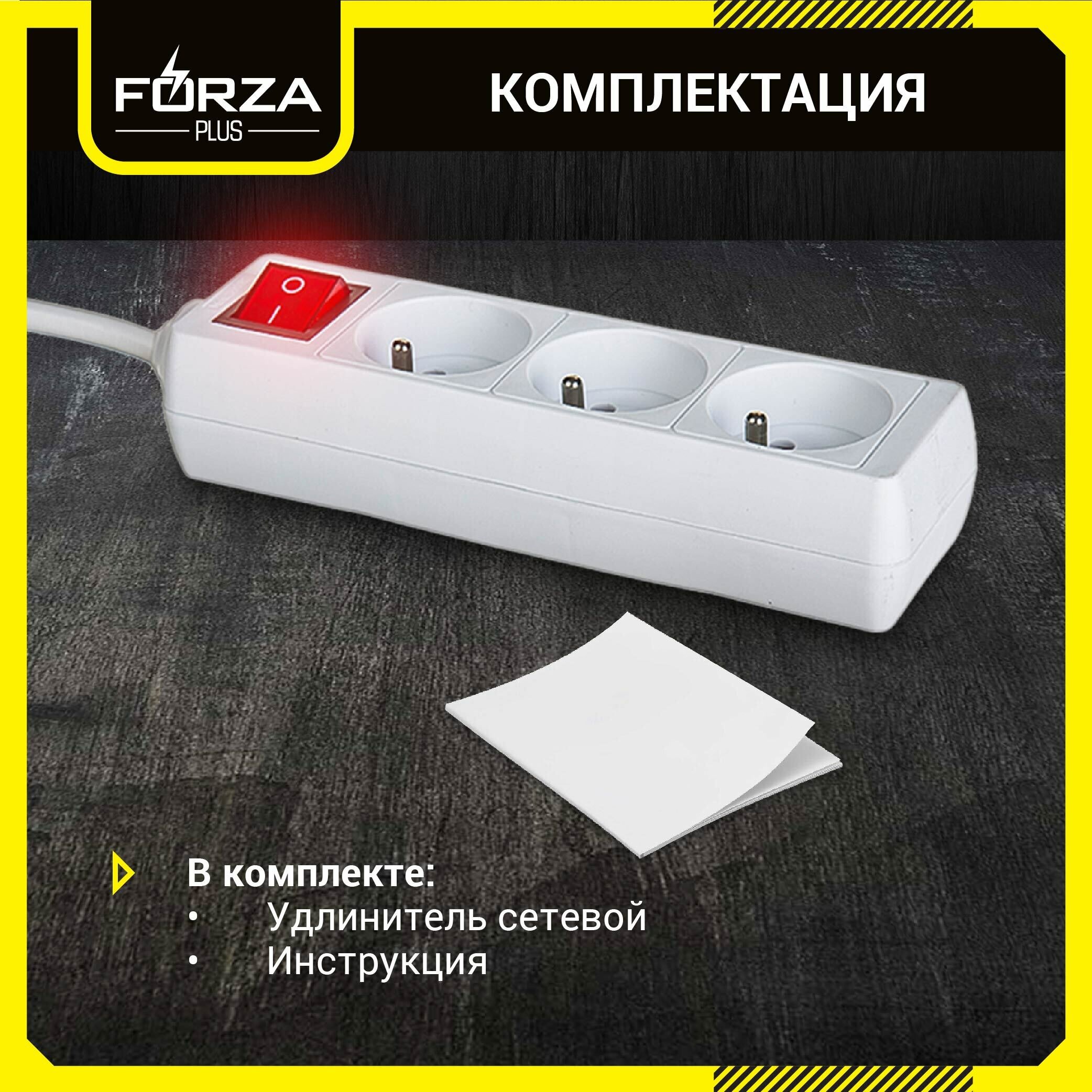 Купить Удлинитель 3 гнезда FORZA PLUS 1,5кв.мм 5м.с заземлением, выключателем, евро, 16А, 3500ВТ