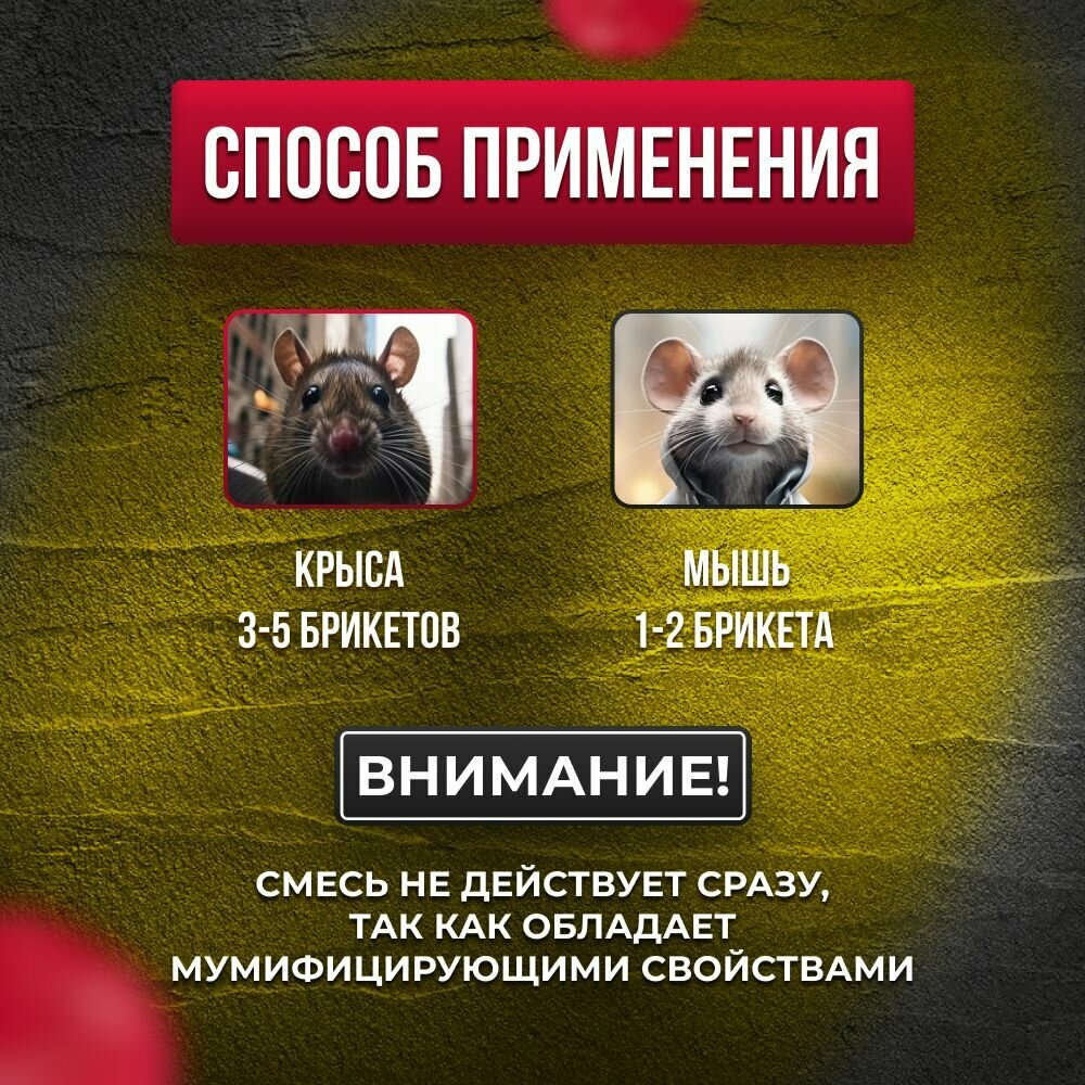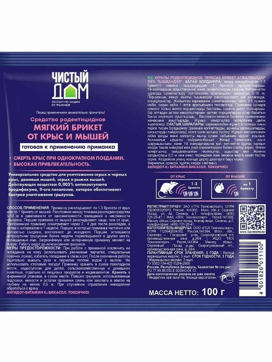 | Дополнительная информация | Активное действующее вещество последнего поколения обеспечивает гибель грызунов на 3-7 день после однократного поедания ими приманки |